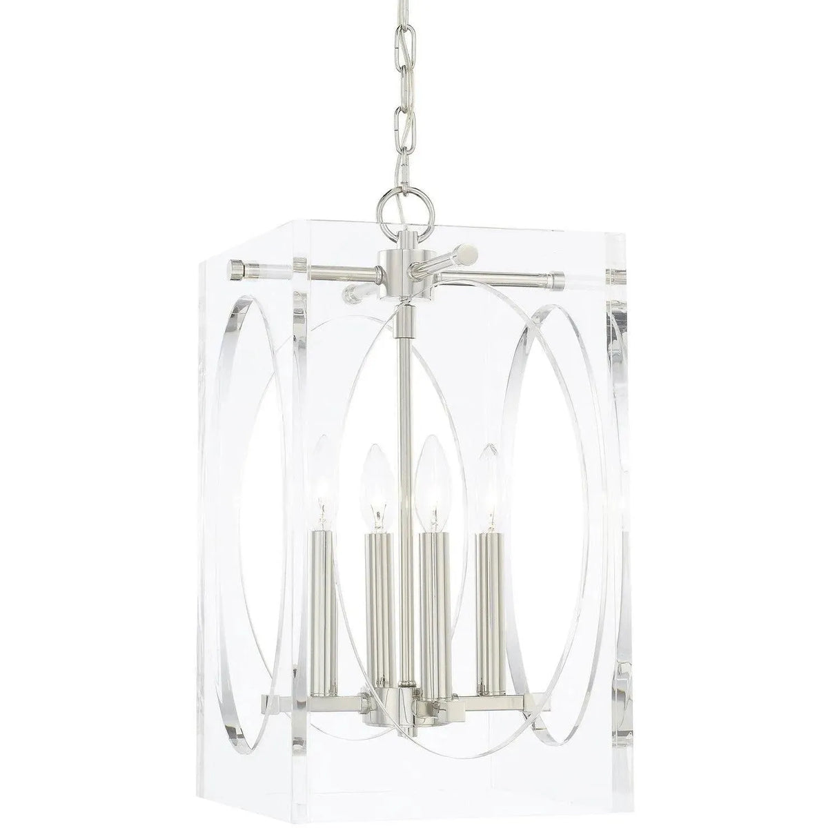 Finish: Polished Nickel Material: Acier Dimensions: 12" W x 12" L x 20" H Weight: 18 lbs. Canopy Size: W5" X D 5" X H1" Bulbs: 4 x Candelabra E12 Candelabra 60.00W, Dimmable Wire: 120" Chain: 72" Collection: Drake