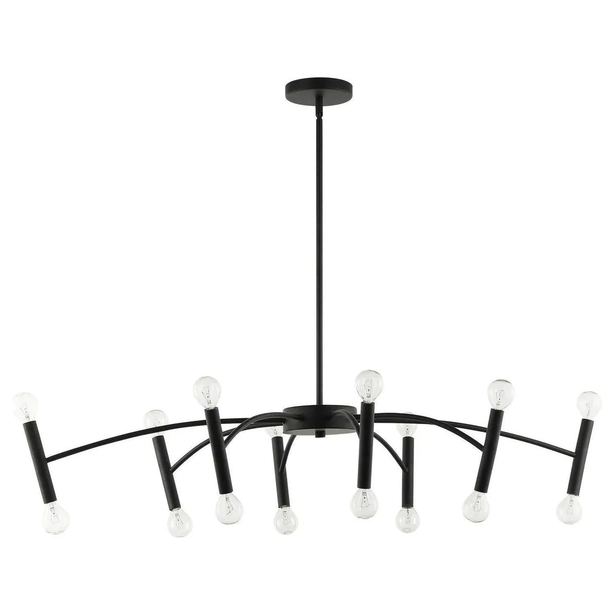 The fixture showcases precision metalwork in a refined matte-black finish, exposed-socket detailing for ambient illumination, and thoughtfully angled arms that distribute light across long surfaces — ideal above dining tables, conference suites, or reception islands.