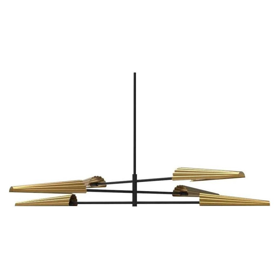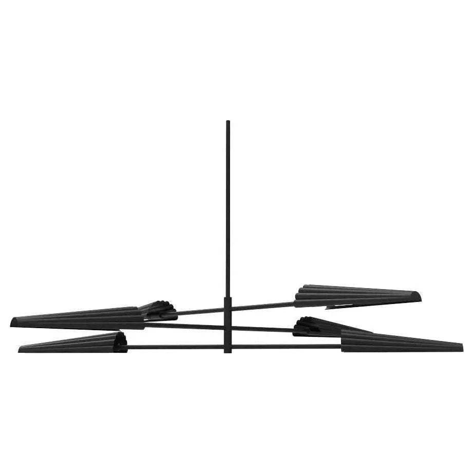 Cassie Chandelier by Dainolite — a sculptural, linear statement light that balances refined form with practical illumination. Its elongated, fluted shades and slim central rod create a low-profile silhouette that reads as modern and architectural in plan.