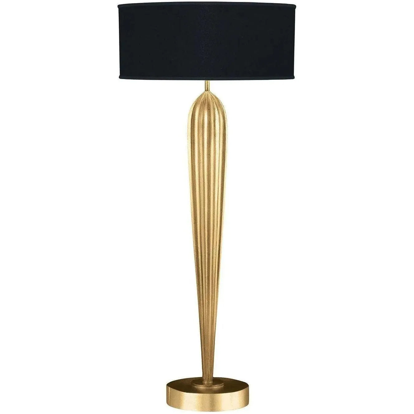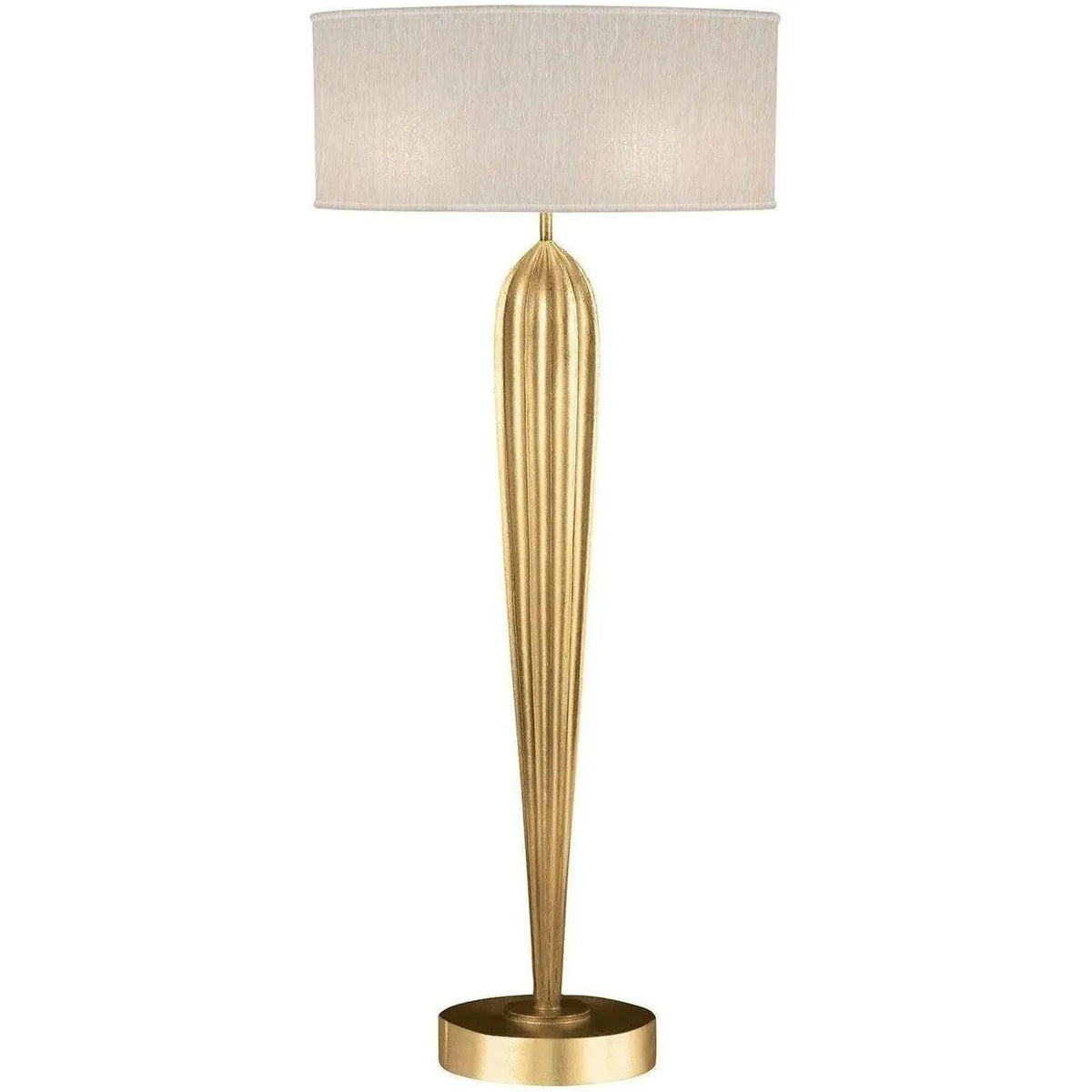 Lampe de table dans une finition à la feuille d'or brunie avec des reflets bruns subtils et des abat-jour en lin texturé blanc avec une galerie en métal percé dans une finition à la feuille d'or assortie.