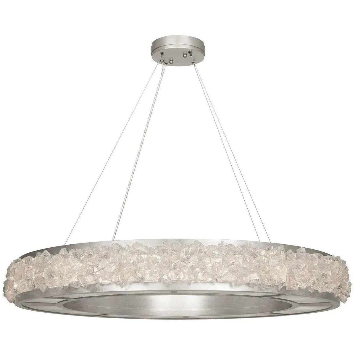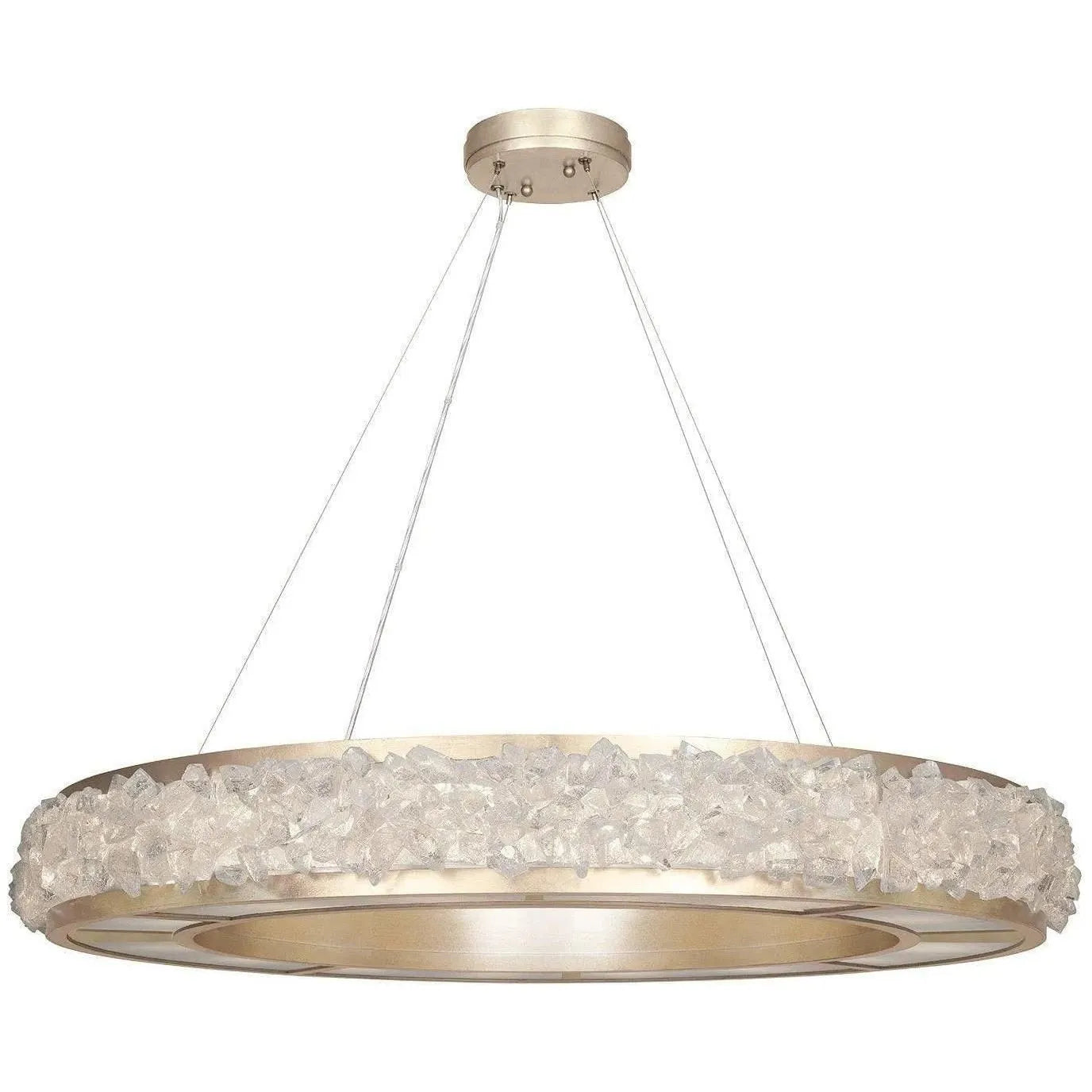 Suspension dans une finition feuille d'or teintée champagne avec des centaines de pierres précieuses en verre de cristal brut qui réfractent la lumière d'une manière qui rappelle les cristaux de glace des cirrus qui forment le halo lunaire dans le ciel nocturne gelé. Également disponible en feuille d'argent platinée ou en noir mat.