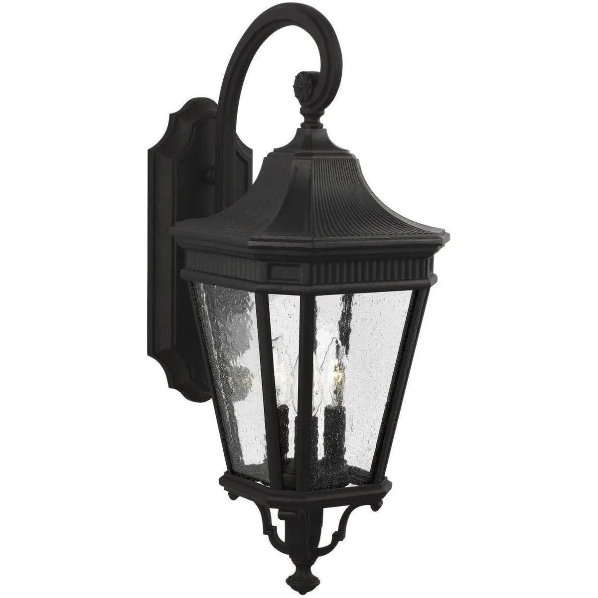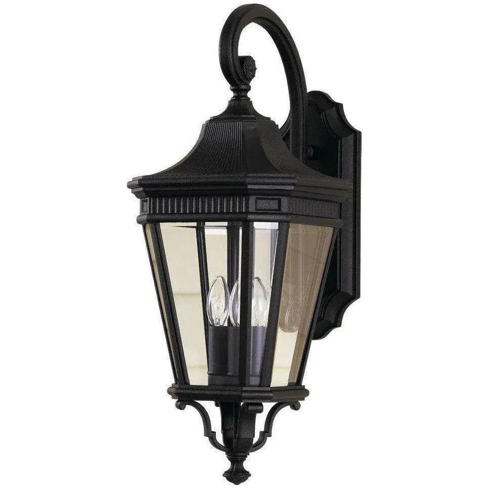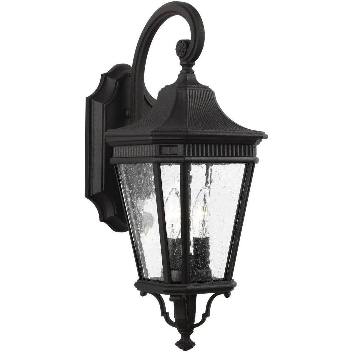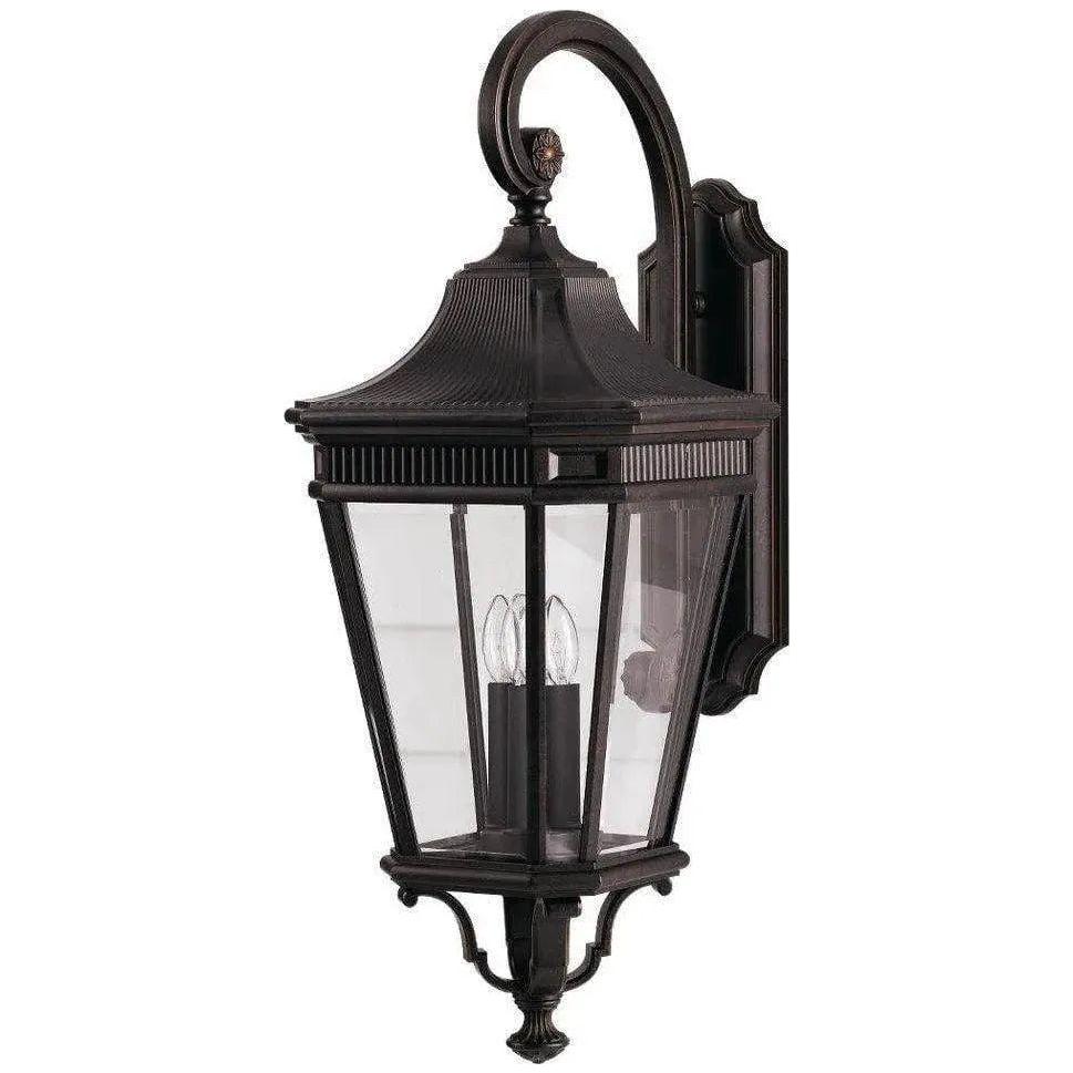 La conception traditionnelle et antique inspirée des lanternes à gaz de Cotswold Lane présente une moulure en forme de denticule au sommet de chaque vitre biseautée. Le profil de Cotswold Lane est intemporel et élégant. Disponible avec deux options de finition et de verre : un cadre noir ou bronze grec avec des panneaux de verre clair biseauté ou de verre transparent granuleux.