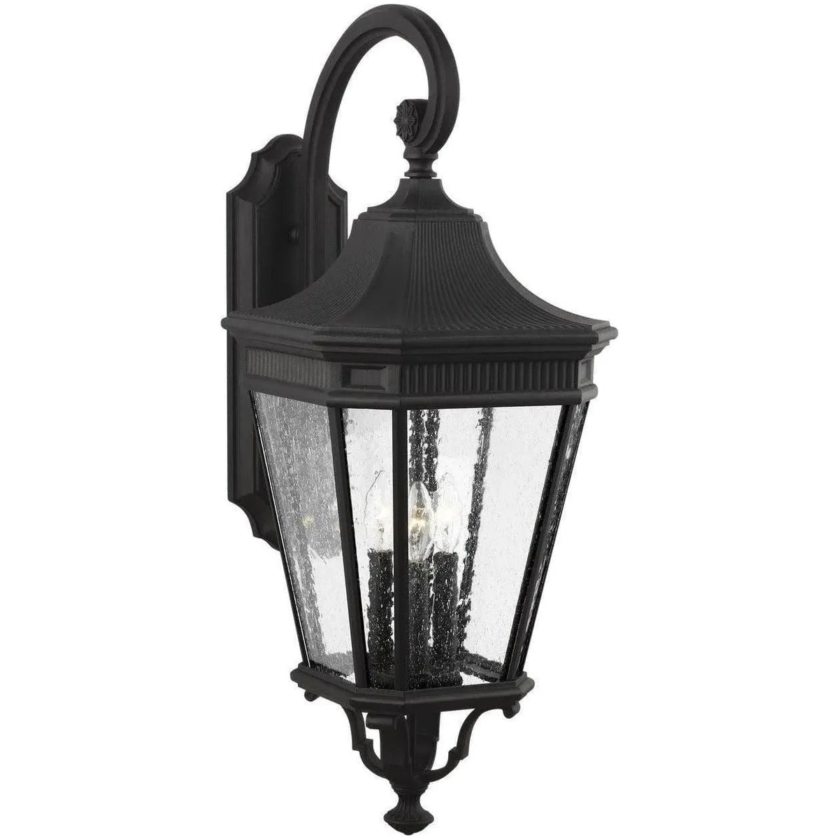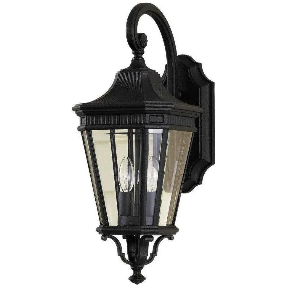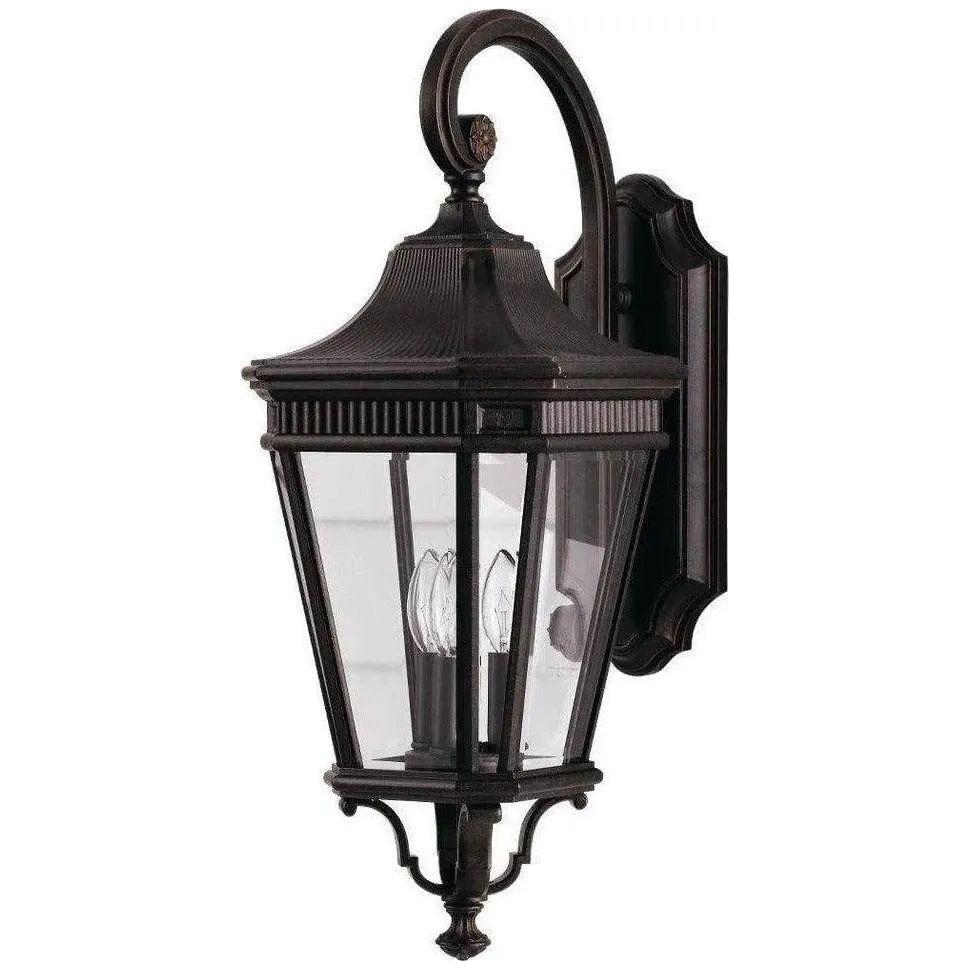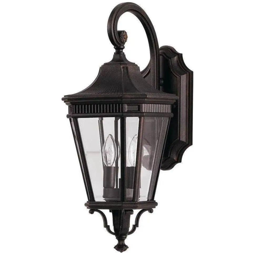 La conception traditionnelle et antique inspirée des lanternes à gaz de Cotswold Lane présente une moulure en forme de denticule au sommet de chaque vitre biseautée. Le profil de Cotswold Lane est intemporel et élégant. Disponible avec deux options de finition et de verre : un cadre noir ou bronze grec avec des panneaux de verre clair biseauté ou de verre transparent granuleux.