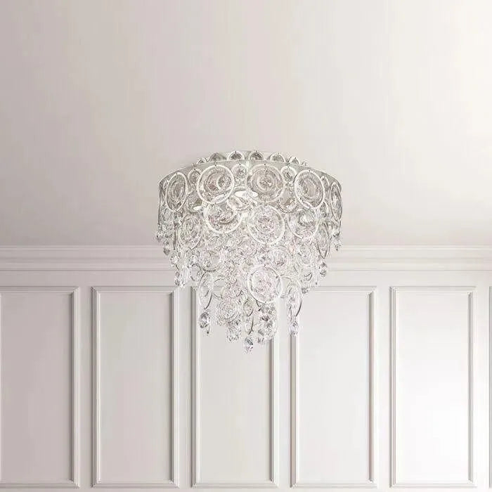 Expertly crafted with hand-cut crystal and a polished metal frame, the fixture delivers layered sparkle and refined presence while remaining compact as a semi-flush mount. It balances form and function for corridors, powder rooms, or intimate dining areas where ceiling height is limited but impact is required.