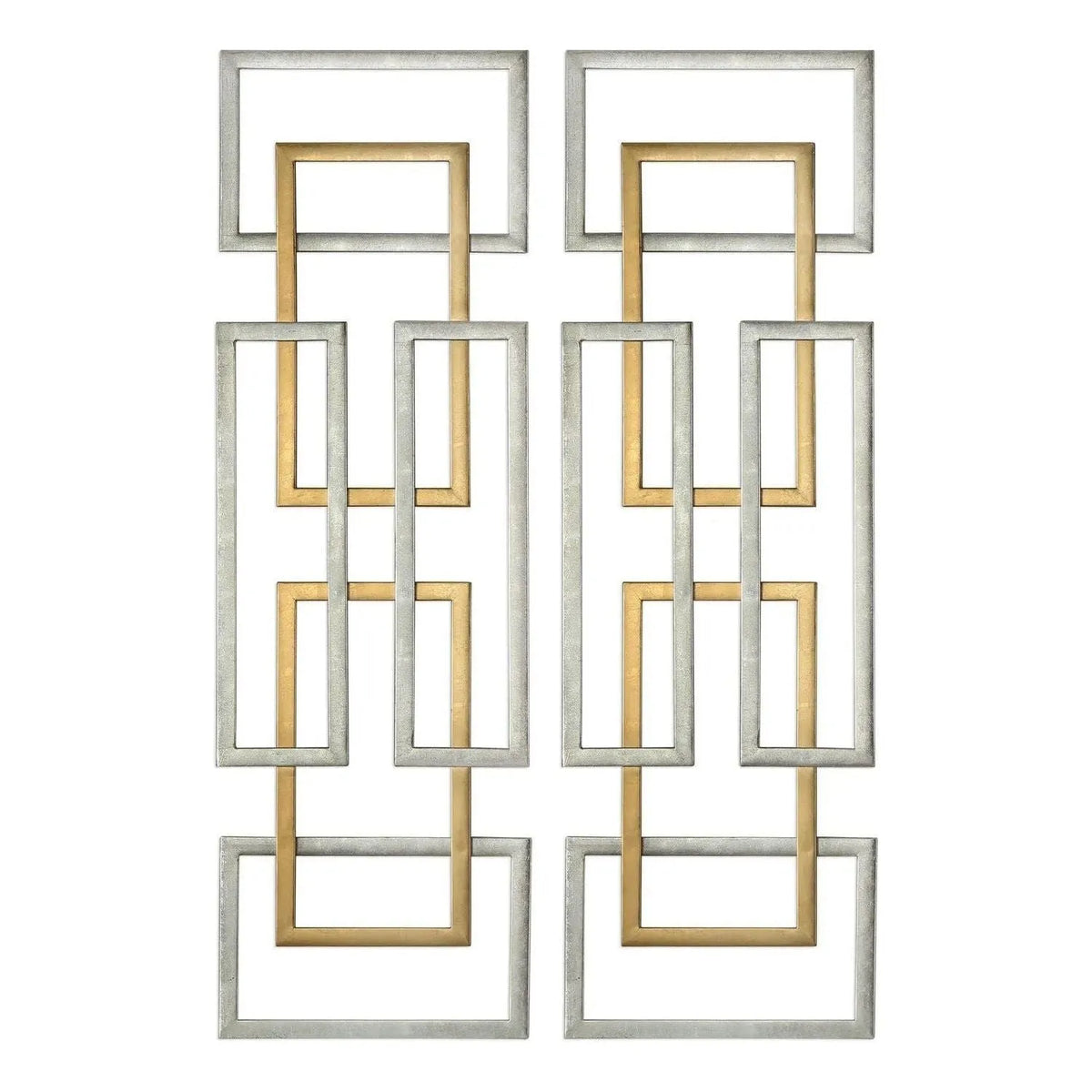 Rectangles géométriques qui se chevauchent créant un look contemporain dans une combinaison de finition bicolore de feuilles d'or et d'argent légèrement vieillies. Peut être accroché horizontalement ou verticalement.