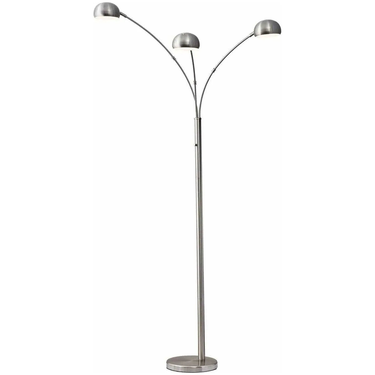 A trio of satin steel shades direct light from the Domino Collection arc lamp to illuminate a room or sectional. At seven feet high, it stands out of the way while the three shades adjust horizontally to even light distribution. Despite their smaller size, the shades each hold a 40 Watt high intensity bulb for plenty of illumination. These three candelabra bulbs come included with the lamp. A rotary switch located on the pole turns the lamp on and off. This lamp has a black cord and is smart outlet compatible. Bulbs included.