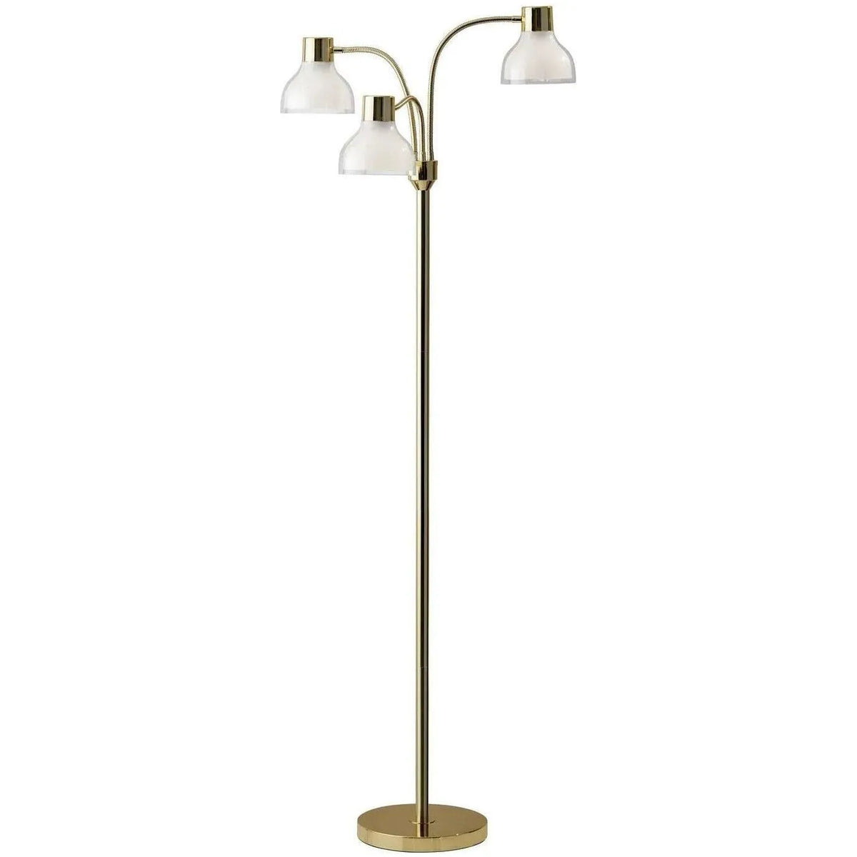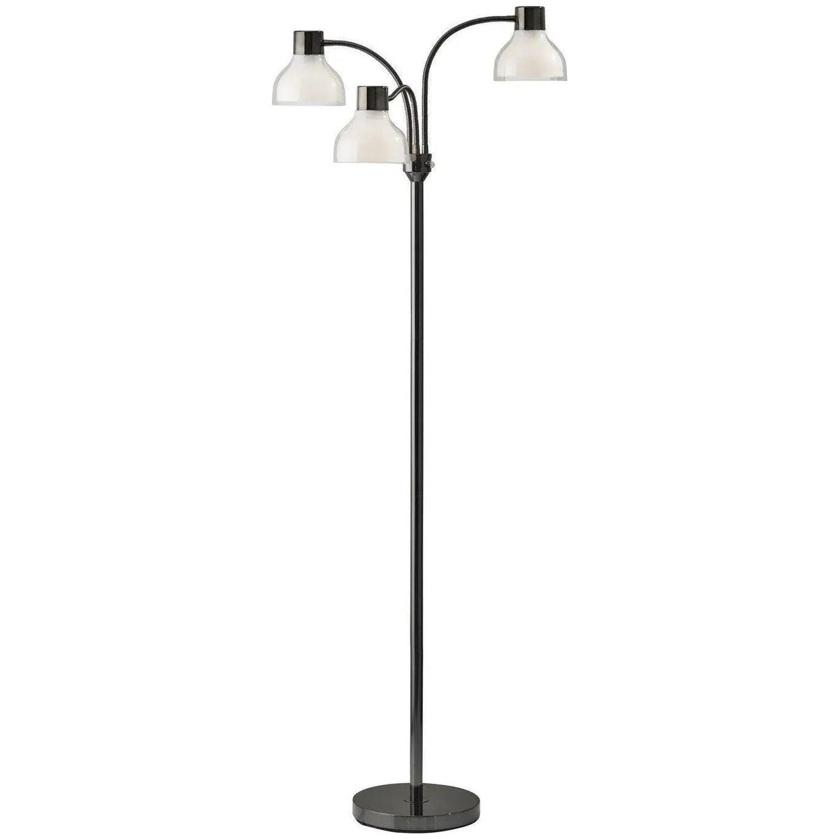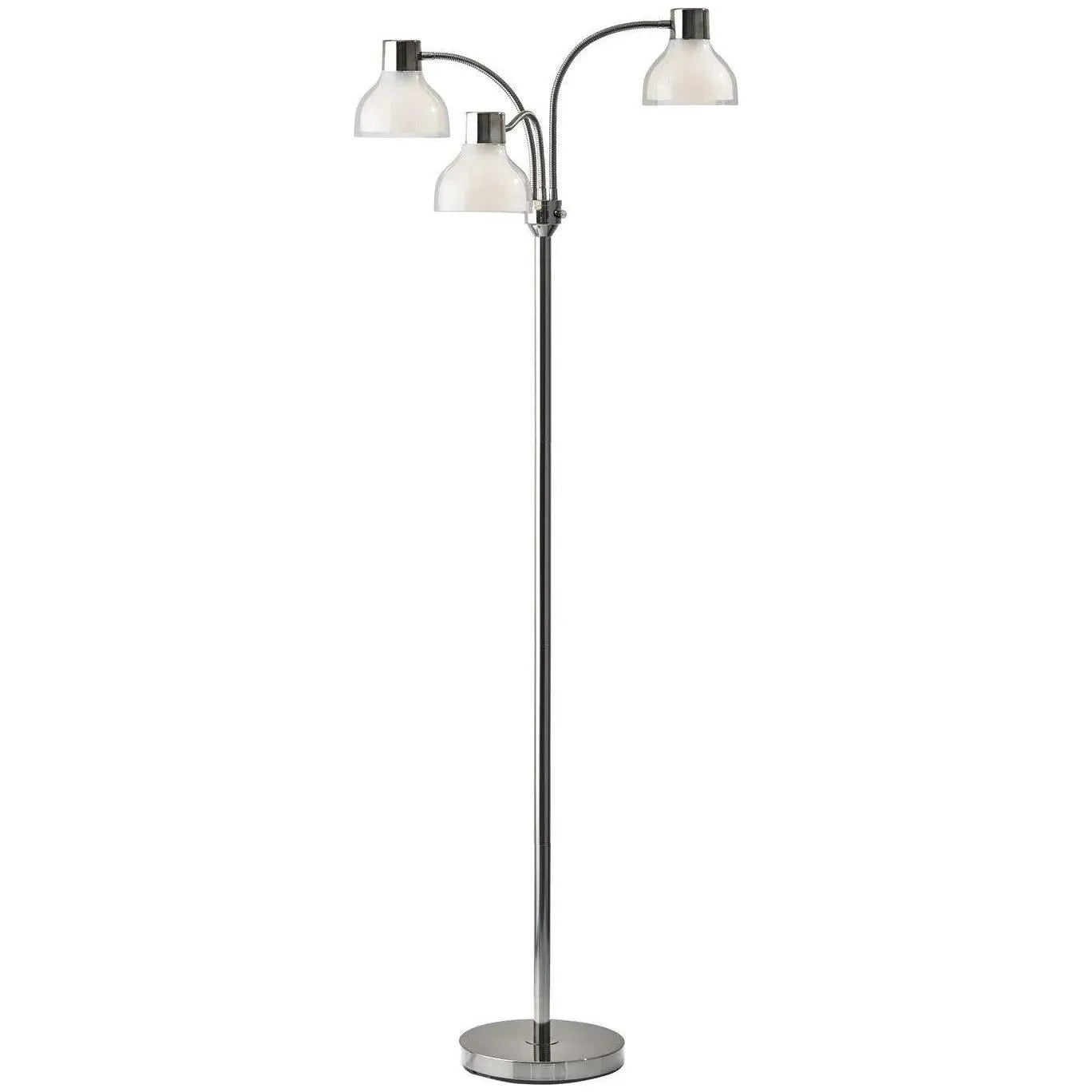 Enhance your bedroom or living room with the Presley 3-Arm Floor Lamp. A simple, yet functional style updated with a black nickel, shiny gold, or polished nickel finish and a unique shade construction. A clear plastic outer shade covers a frosted inner shade creating a beautiful glow when lit. Three adjustable gooseneck arms conveniently bring the light to wherever it is needed. This floor lamp can function as both an ambient light source for a large living space or directive task lighting for a workspace. . A rotary switch on the pole adjusts the light to 3 different settings: 1 light on, 2 lights on, all lights on, and off. This lamp is smart outlet compatible and has a clear cord. Bulbs are not included.