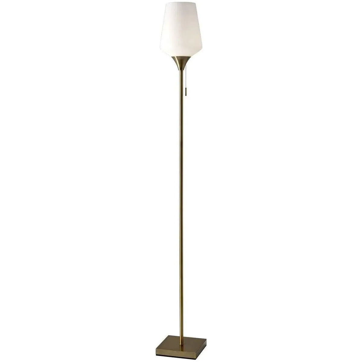 The Roxy Floor Lamp is the perfect addition to a modern, elegant living space. With a thin and simple silhouette, the beauty lies in the stunning illumination of the opal white glass shade. This timeless style holds a 100 Watt bulb that can be turned on and off by a nylon pull chain switch. A clear cord comes neatly out of the compact, antique brass or brushed steel finished square base. This lamp is smart outlet compatible. Bulb is not included.