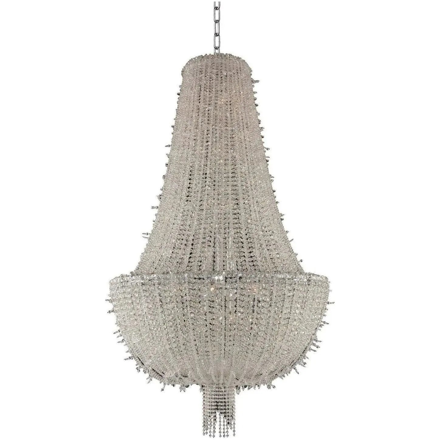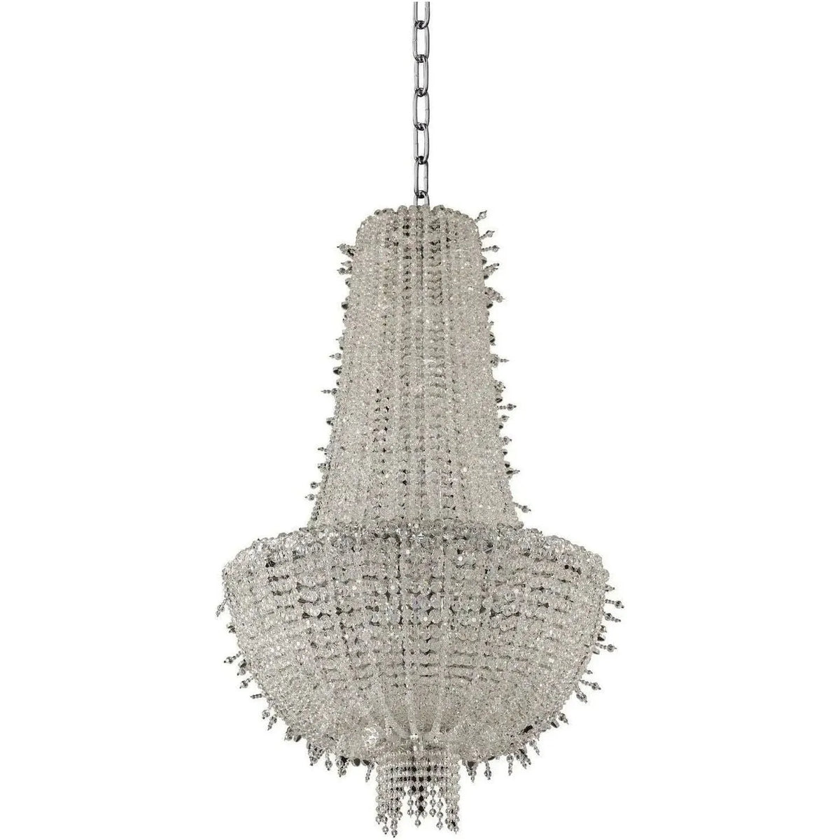 A modern take on a classic empire shaped chandelier. Our version features multi layers of delicately draped crystals for a full and dimensional brilliant ice like glow. Works in a modern, classic or shabby chic environment. Designed with your lifestyle in mind.