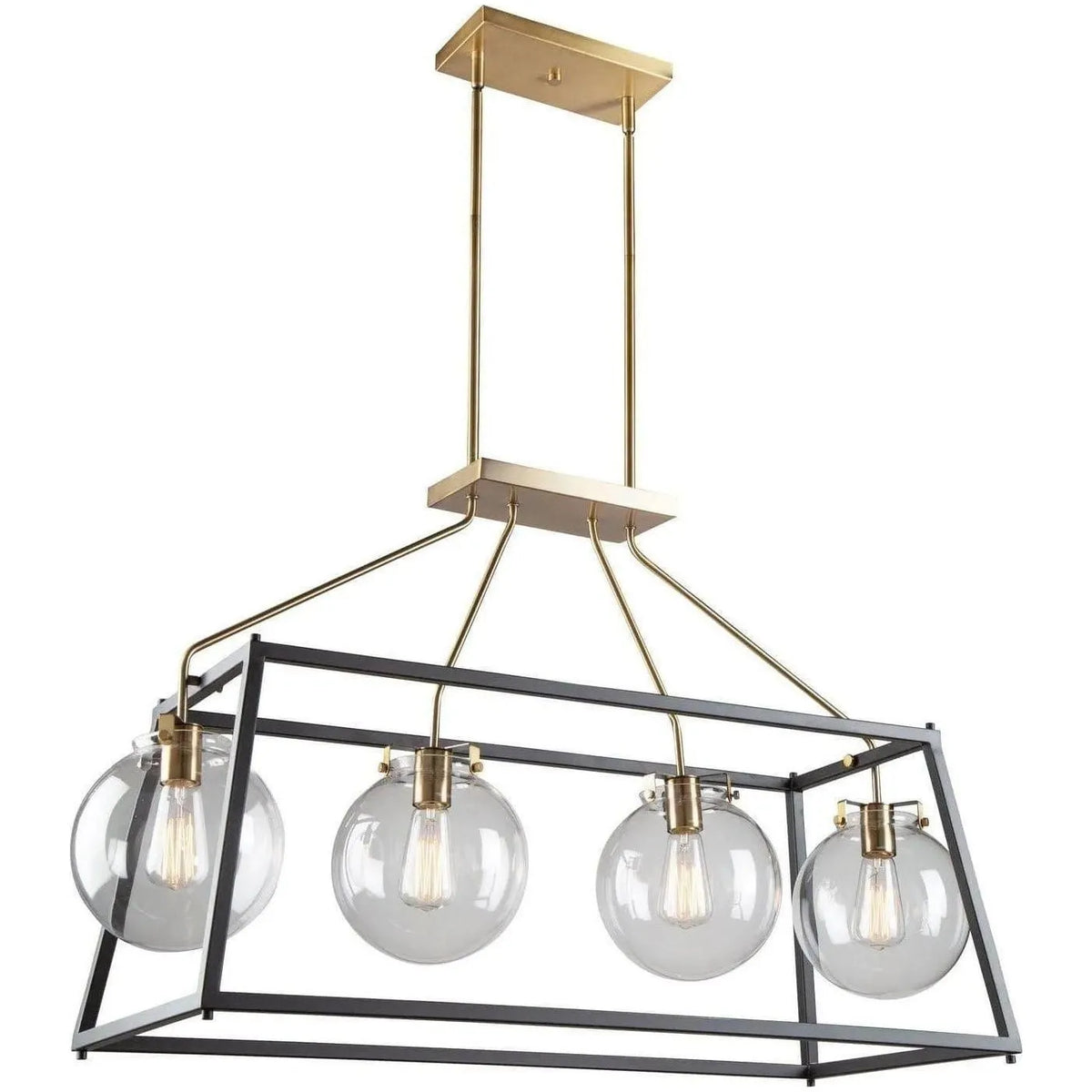 Artcraft Lighting’s Bridgetown Four Light Island Pendant presents a considered balance of form and function: a tapered black rectangular frame that defines space, paired with rich harvest brass hardware and four clear circular glass shades that float within the geometry.