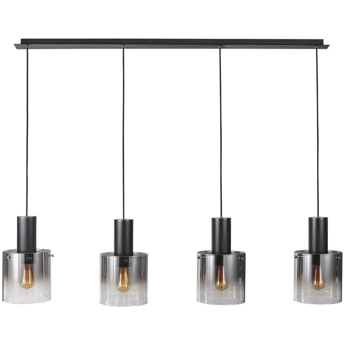 Henley Four Light Island Pendant by Artcraft Lighting — a refined linear island fixture that balances sculptural form with everyday function. Smoke-tinted cylindrical glass shades hover beneath slim black hardware, each pendant suspended on discrete wires for a clean, leveled composition ideal over kitchen islands or gallery tables.