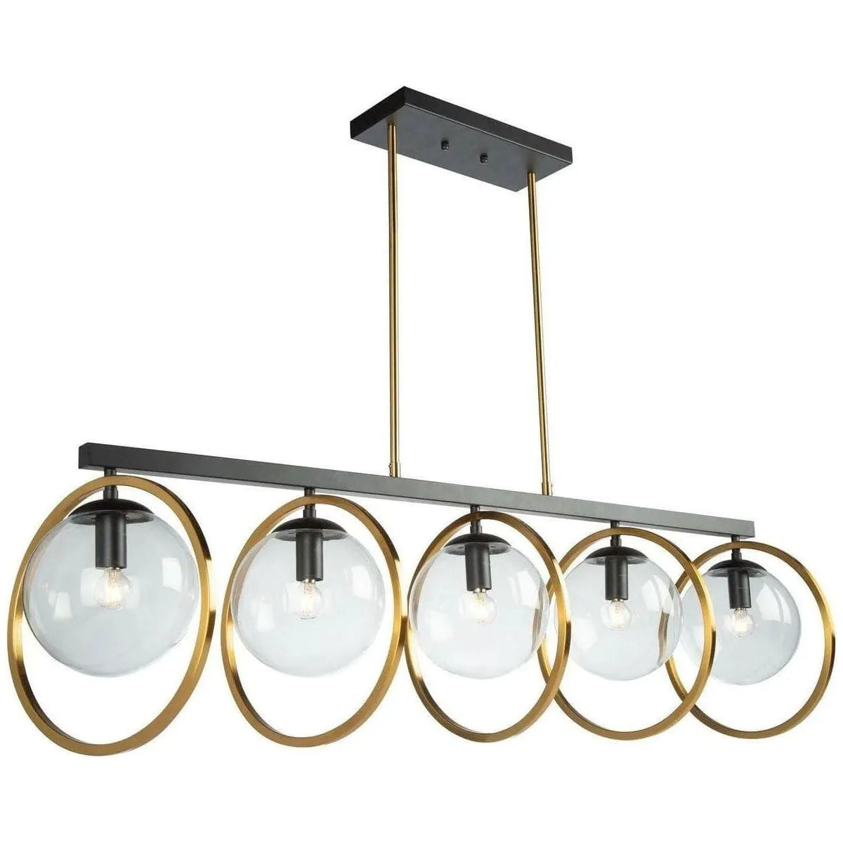 Artcraft Lighting Lugano Five Light Island Pendant — a modern linear statement that balances sculptural form with refined utility. Five clear round glass globes nest inside vintage-brass circular encasings mounted on a matte black bar, creating a rhythmic composition that reads as both architectural and luminous.