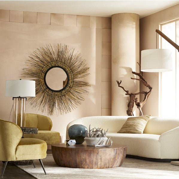 The oversized version of our Jacob Cocktail Table this coffee table is just as ravishing and rustic as its predecessor. Narrow wood slats wrap upwards from the sides of this gently curved drum shaped table. The entire table is finished in a tobacco wash finish that accentuates the natural grain of its solid wood composition. Style alongside the Jacob Side Table (4736) and Jacob Cocktail Table (4303) for a cohesive look. Finish may vary.