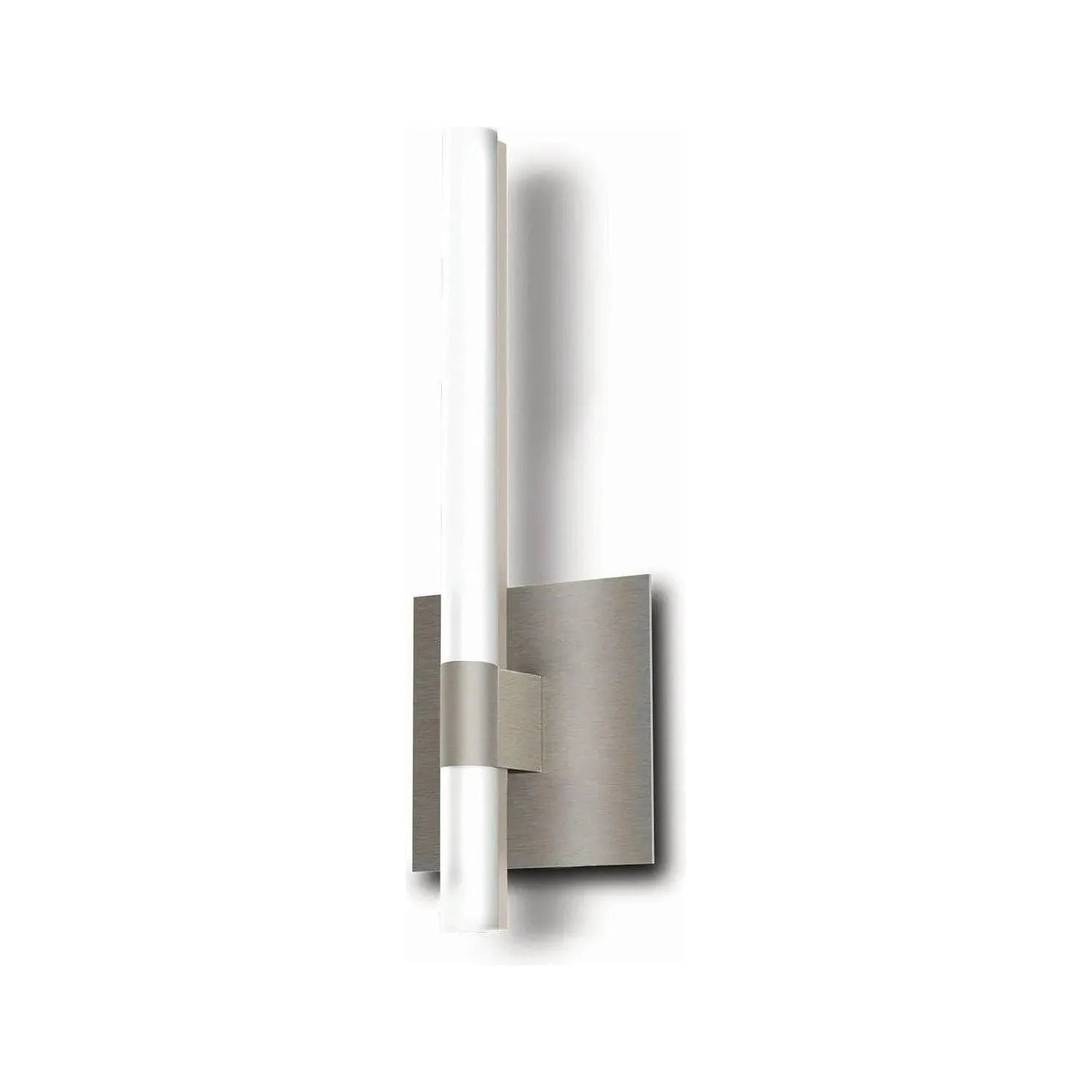 A tubular frosted glass diffuser paired with a stamped steel back plate in Satin Nickel adds contemporary styling to a value-priced sconce