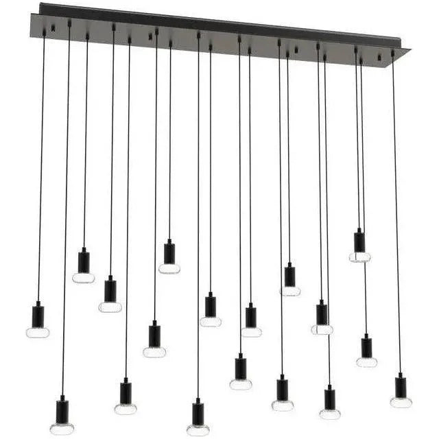 This 38" fixture accepts 18 Seraph pendants which hang 9" to 76" from ceiling. Dimmable, damp location rated, replaceable light source
