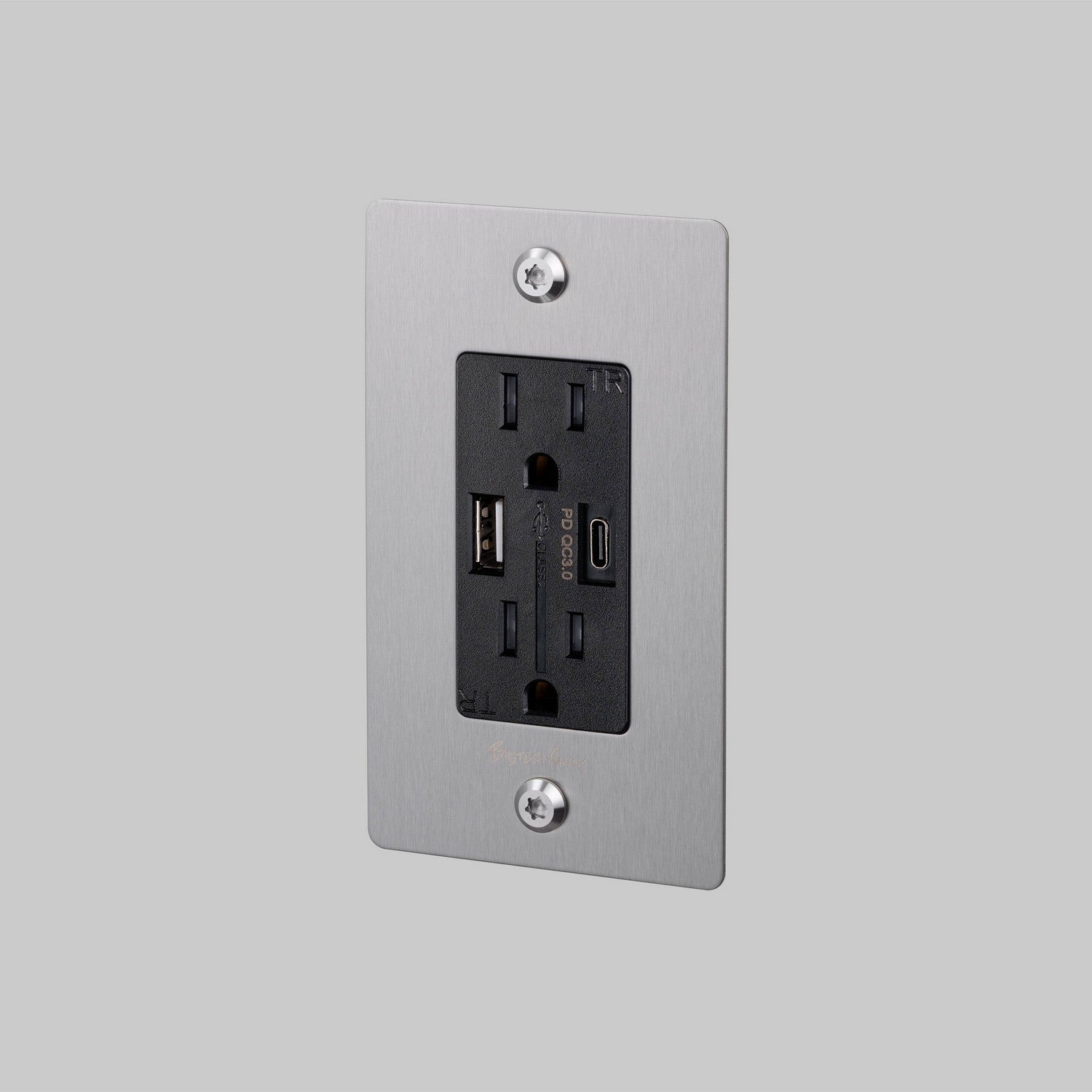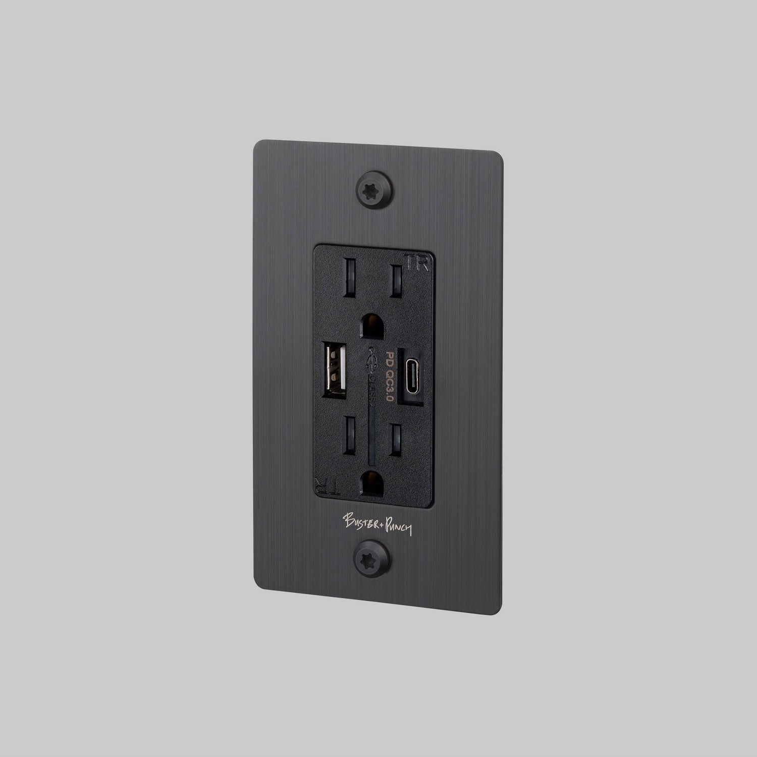 1G combination duplex outlet and USB-A and USB-C charger in black, featuring our solid metal black, coin screws.