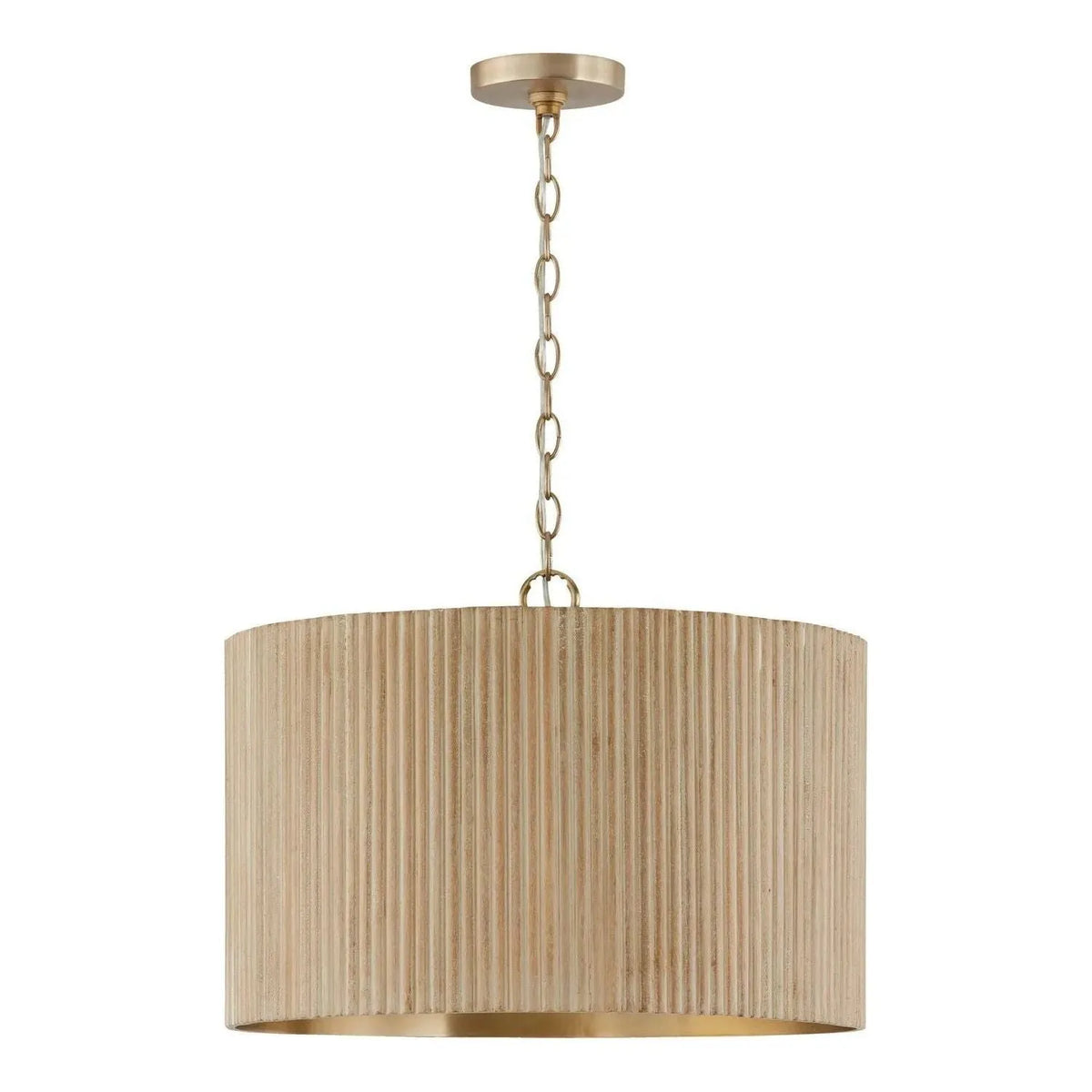 The White Wash fluted mango wood shade evokes natural elegance, while the Matte Brass interior delivers a warm, inviting glow that enhances color, texture, and ambience.