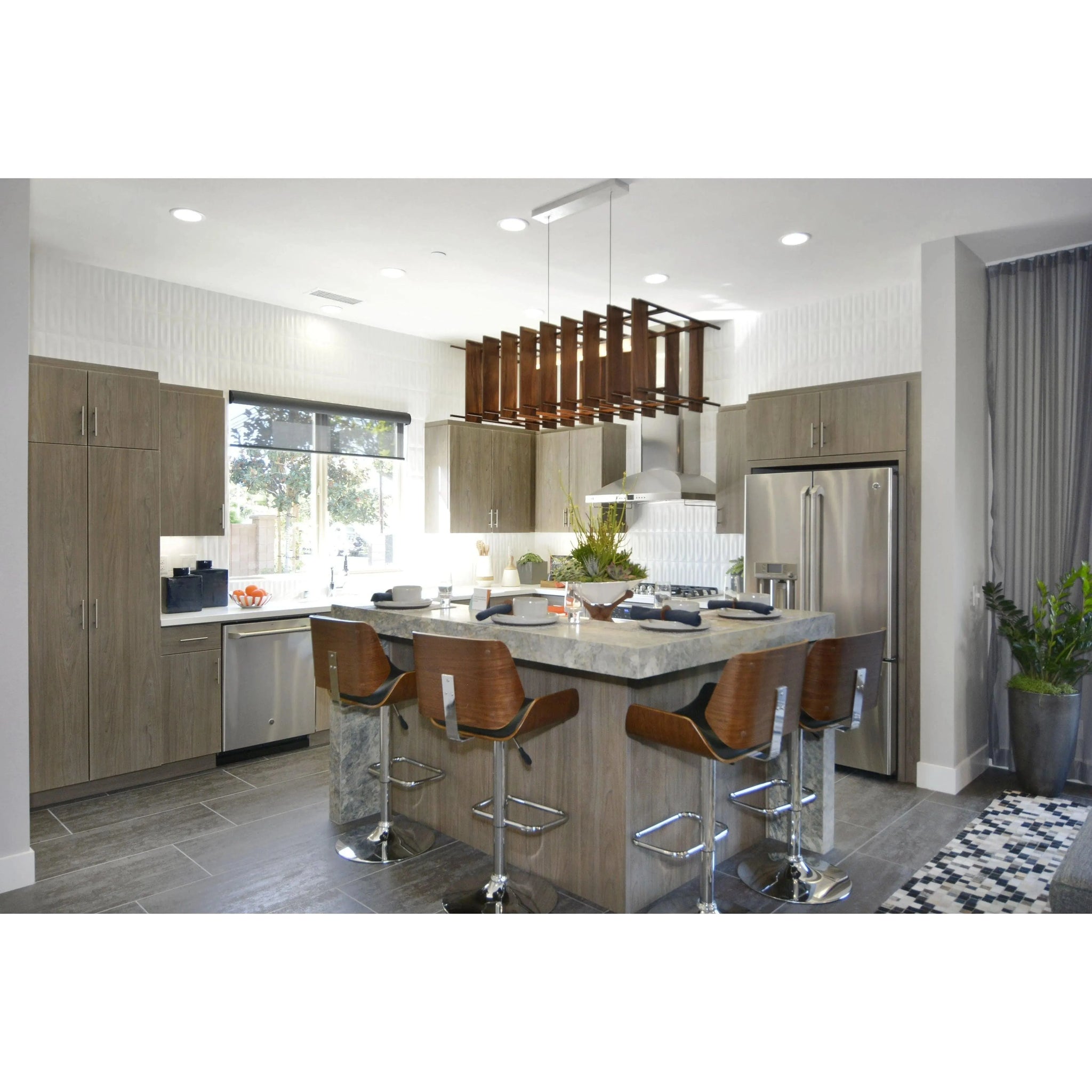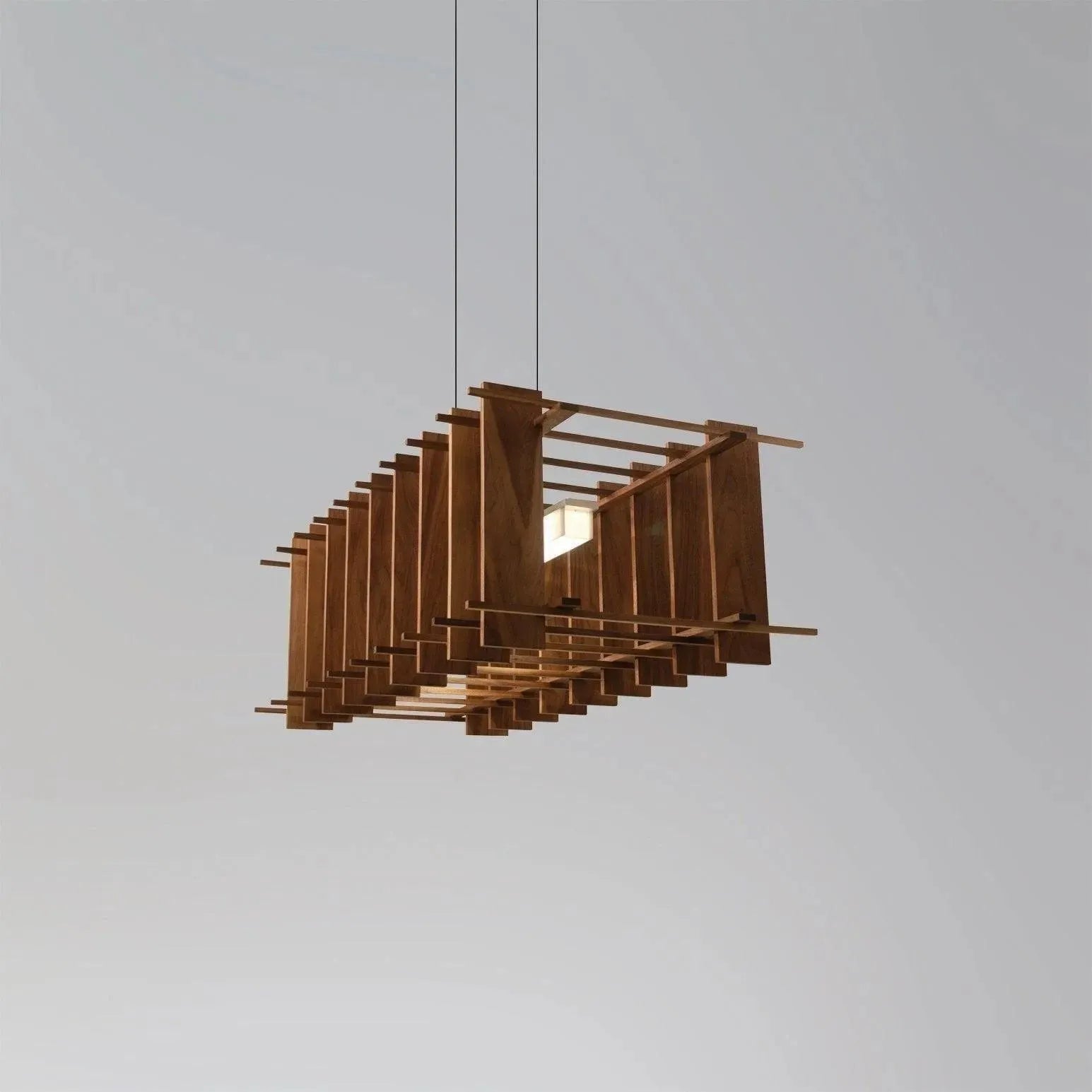 From an architectural anchor to a delicate glow, the Arca blends warmth with modern precision. A sturdy walnut core transitions into a linear LED bar, embraced by an elegant porous cage that softly diffuses illumination and adds texture to your ceiling and room.