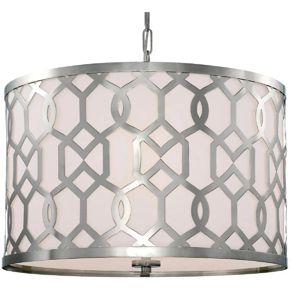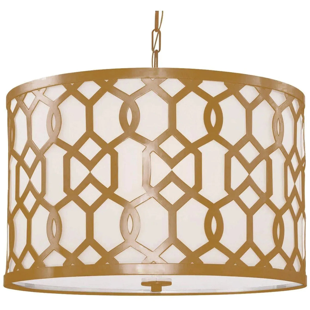 A striking geometric statement, the Jennings collection pairs Libby Langdon's signature classic design with a modern flair. The Jennings is an open, graphic metal design with a white silk drum shade. A perfect marriage of classic and modern creating the ideal elegance.