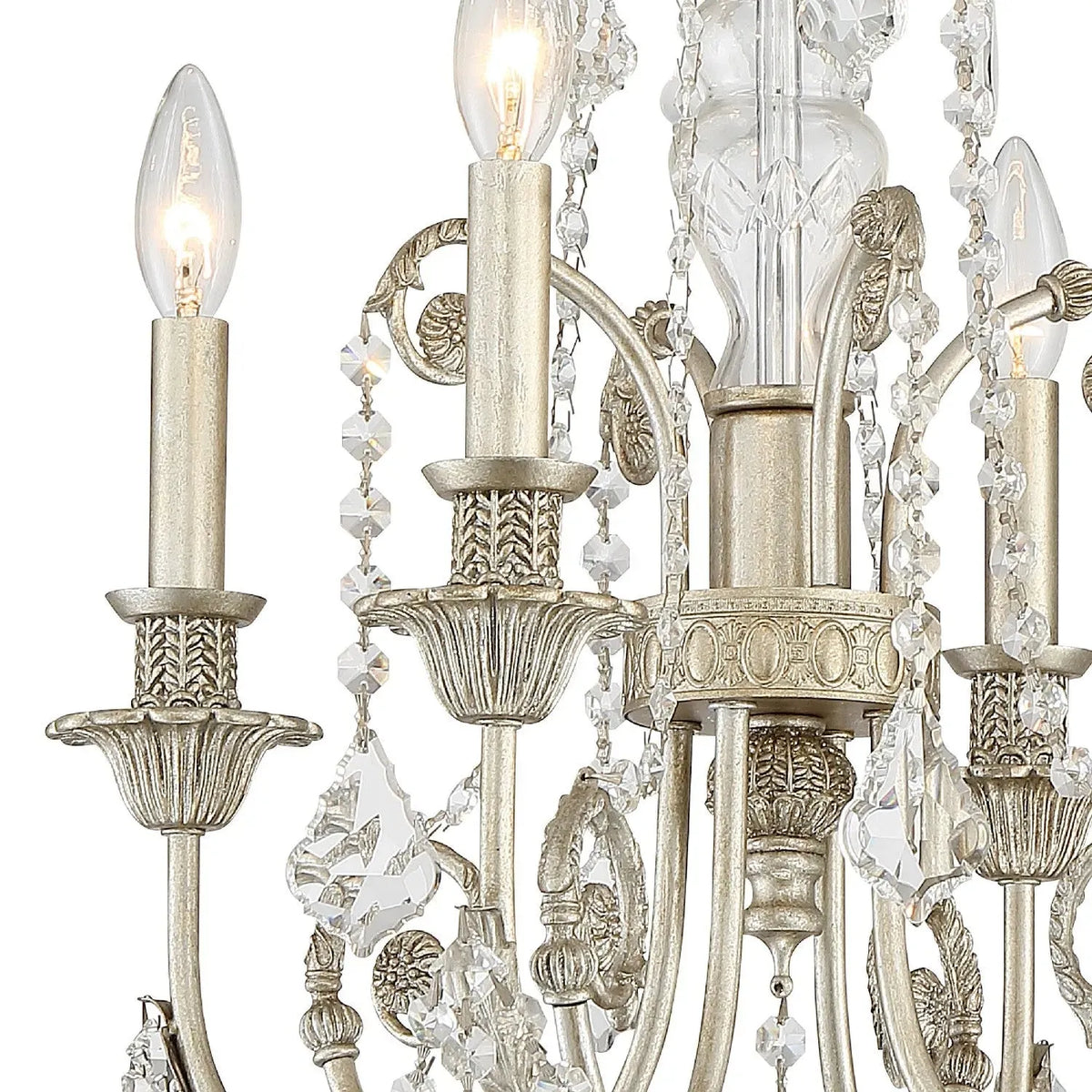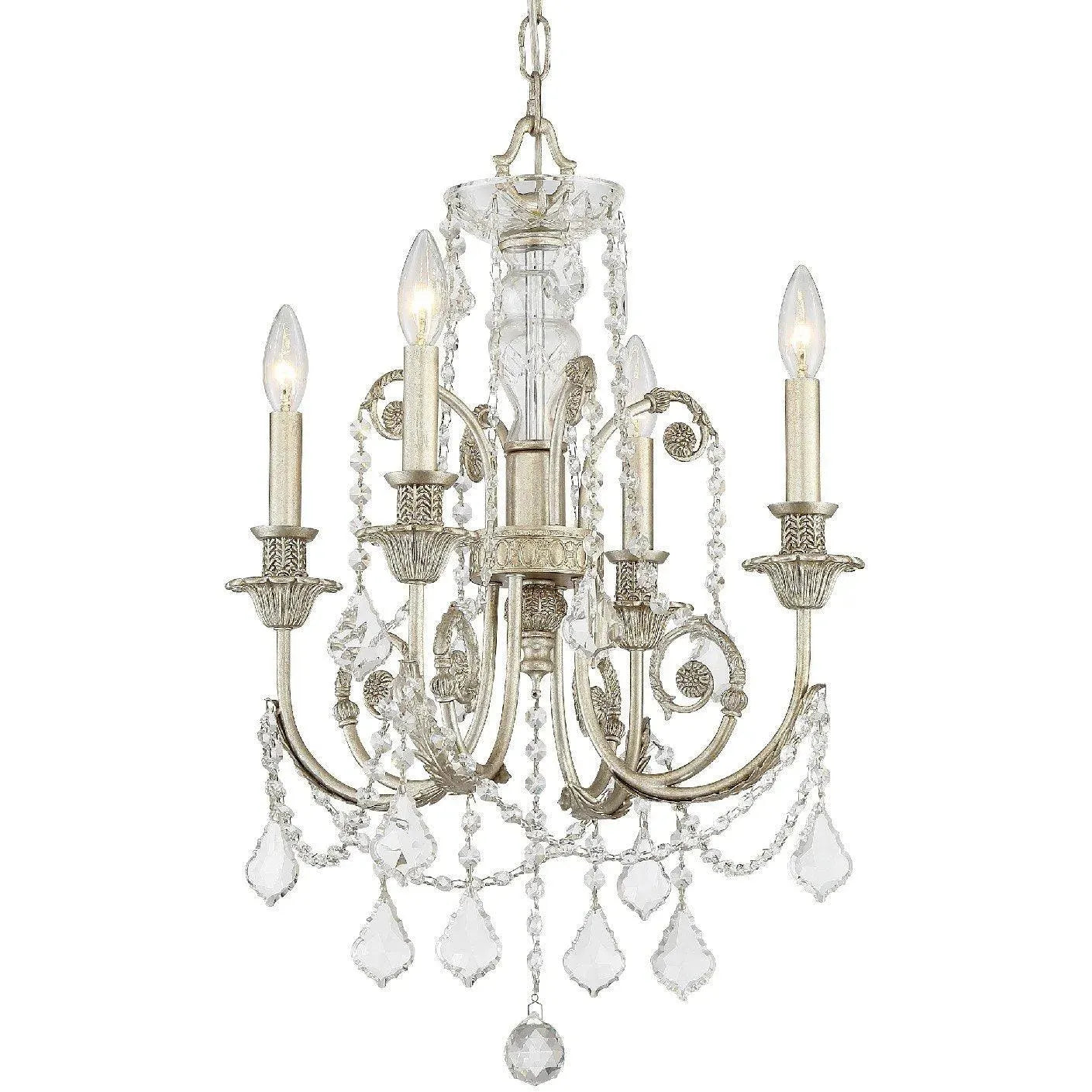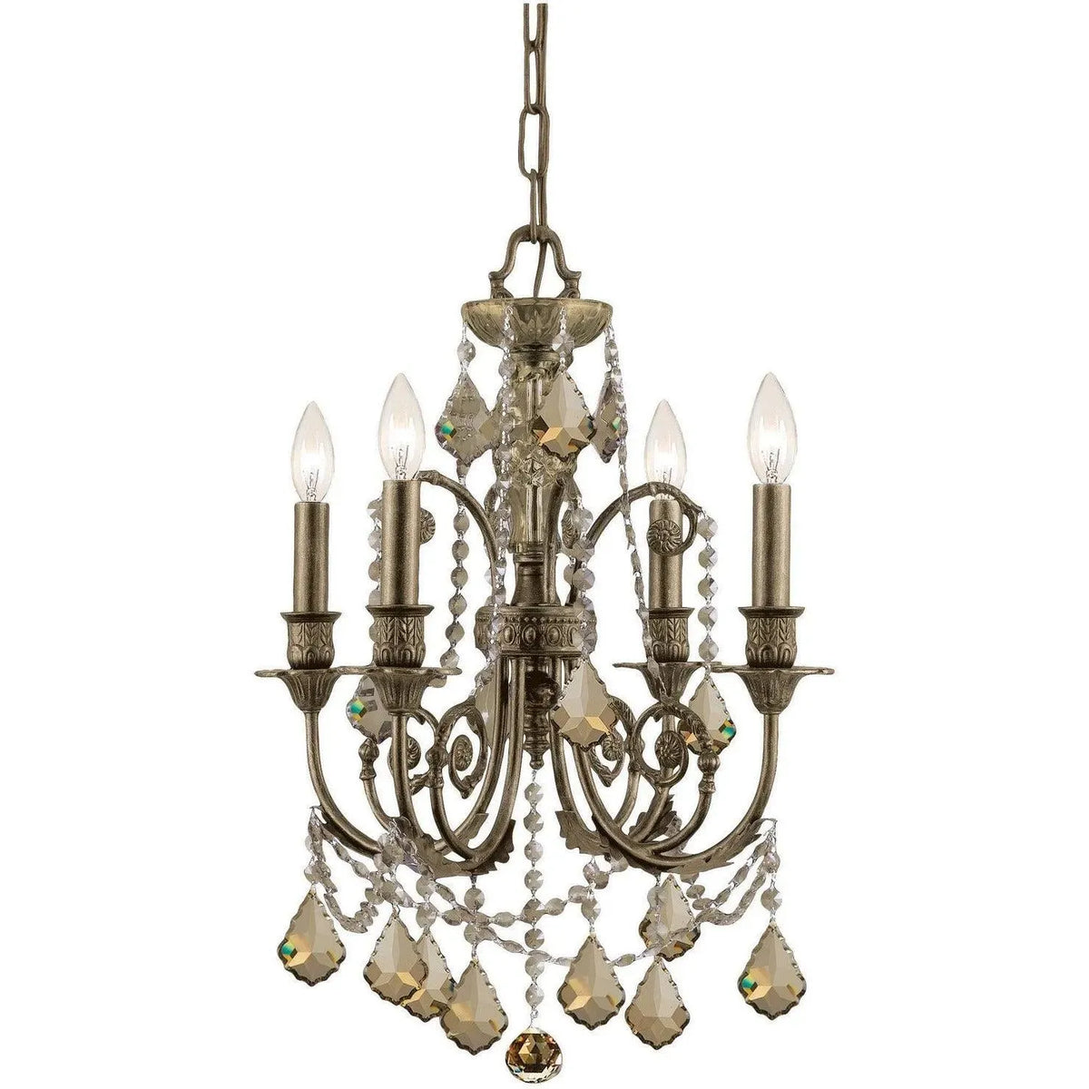 The Regis Four Light Mini Chandelier from Crystorama brings timeless elegance to any room, blending classic wrought iron scrollwork with crystal accents for a warm, inviting glow. Its refined silhouette and sparkling details make it a versatile centerpiece for traditional or transitional interiors.