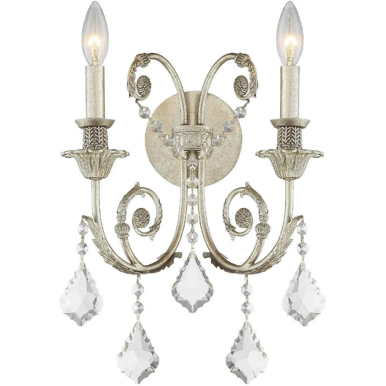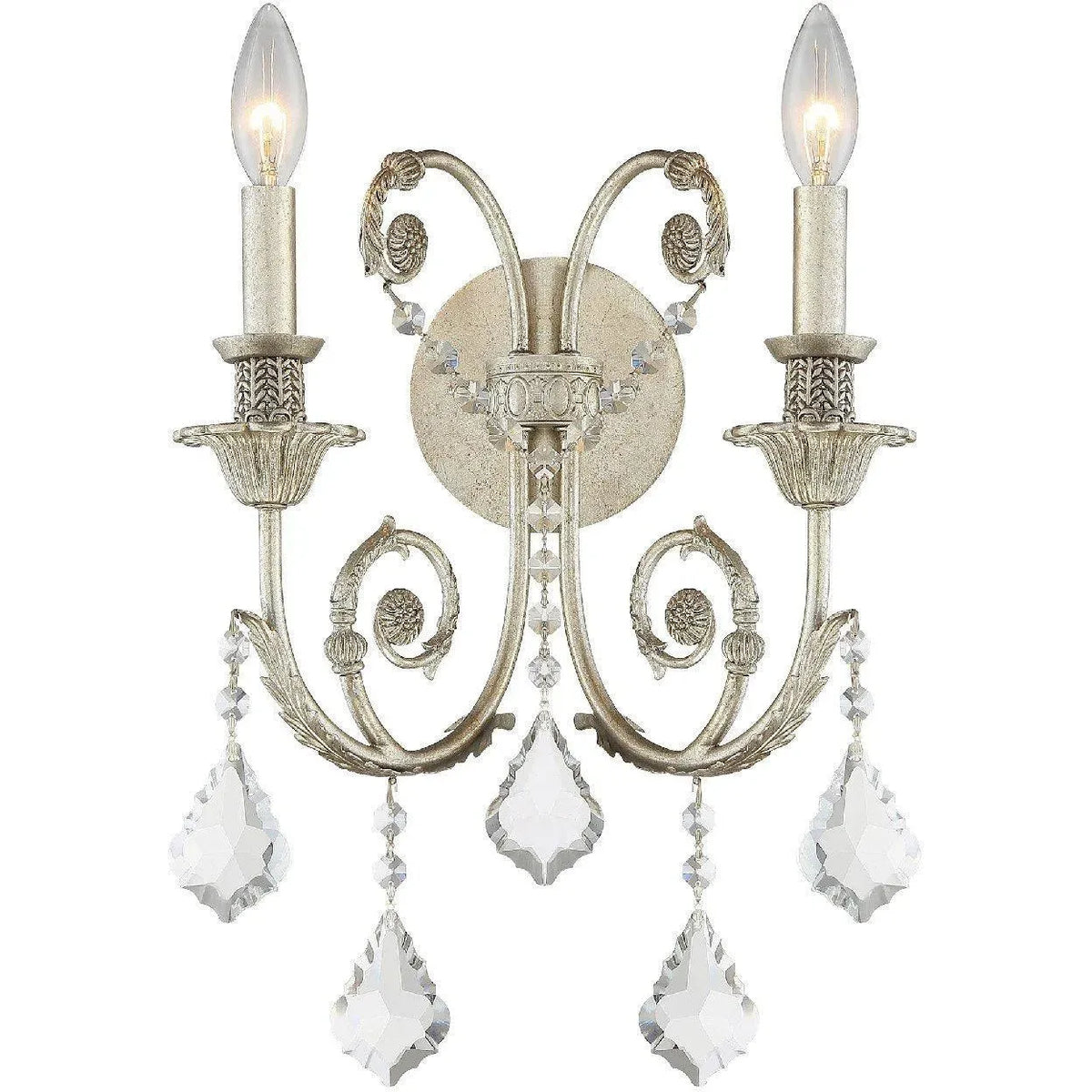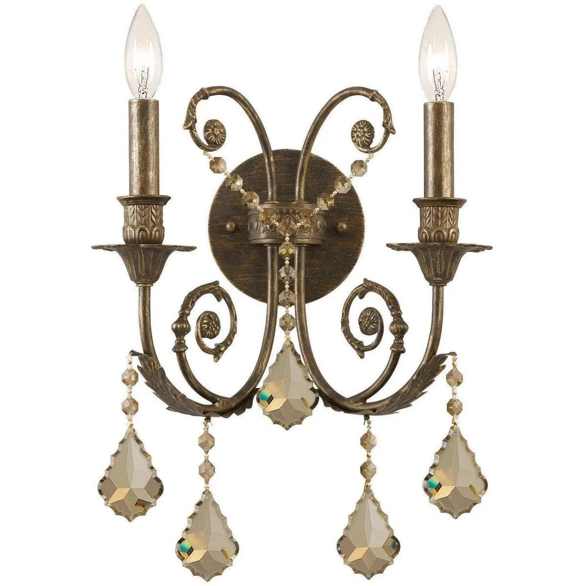 Capture timeless elegance with the Regis Two Light Wall Mount from Crystorama—a candle-style wall sconce that elevates traditional spaces with bronze-toned iron and sparkling crystal accents.