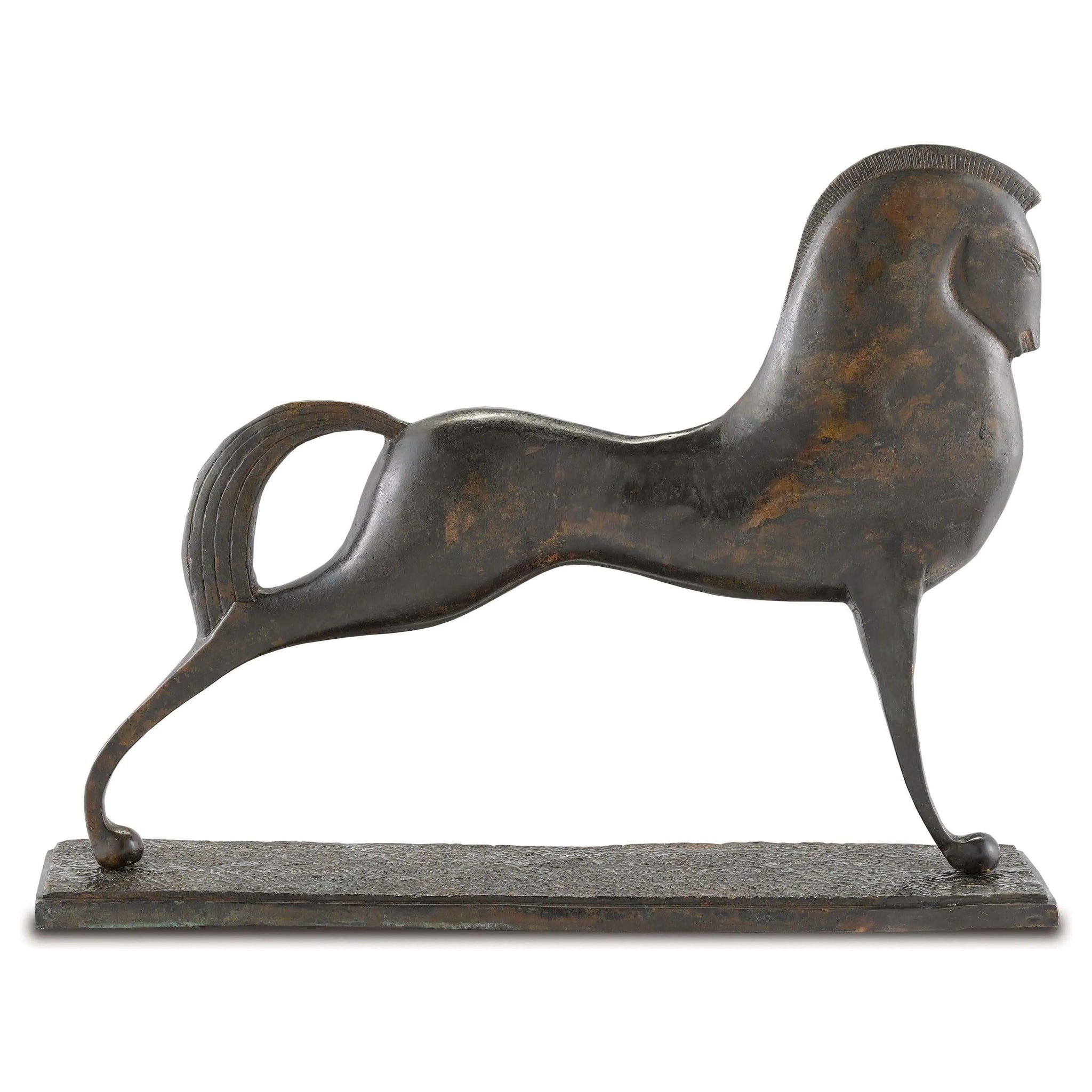The Assyrian Horse Bronze is made from a lost-wax technique where boiling bronze is poured into a mold covering an original wax sculpture that melts away. Once set, there is a very long process of refining the bronze to give it patina. The Etruscan style and the aged finish of this bronze sculpture make it feel like an antique.