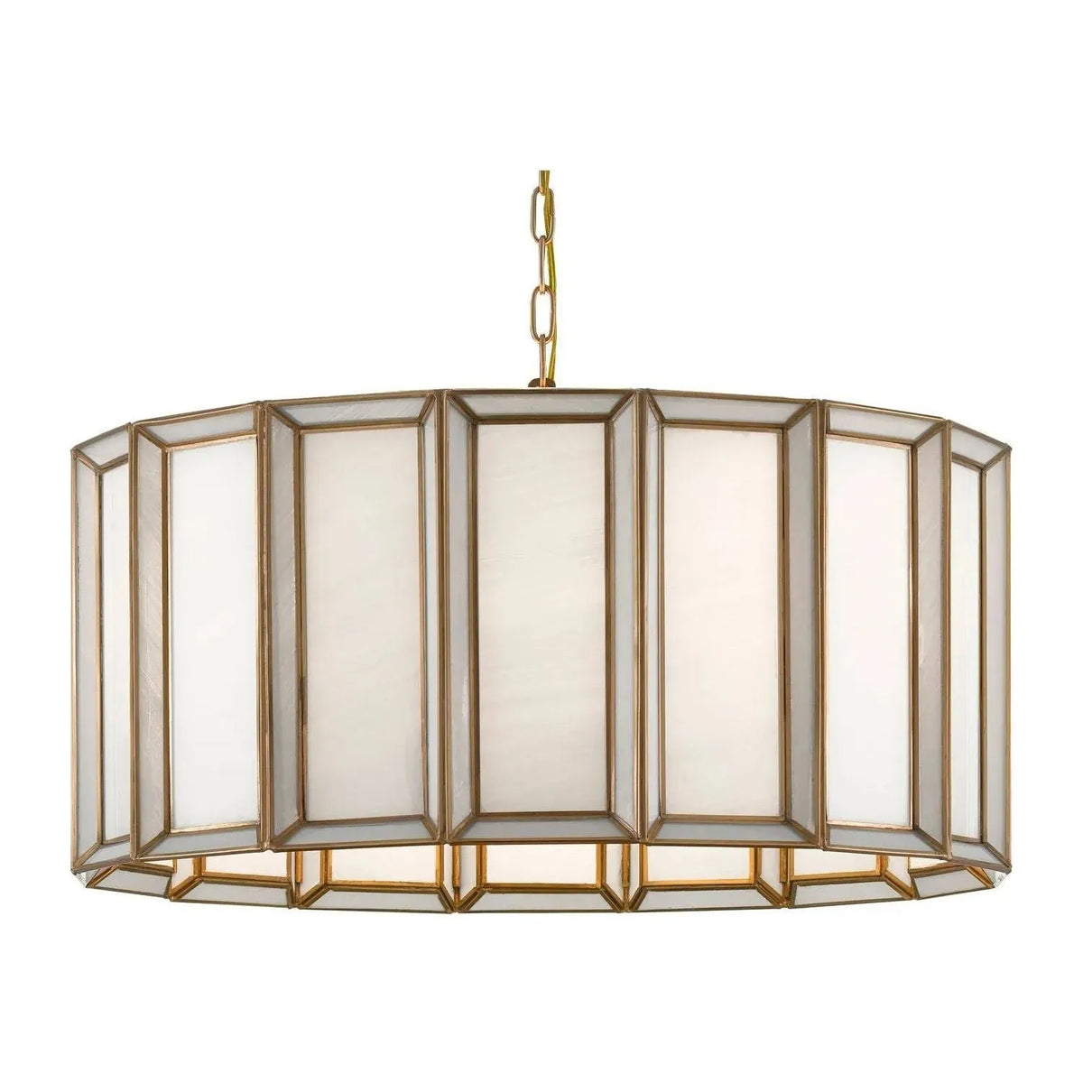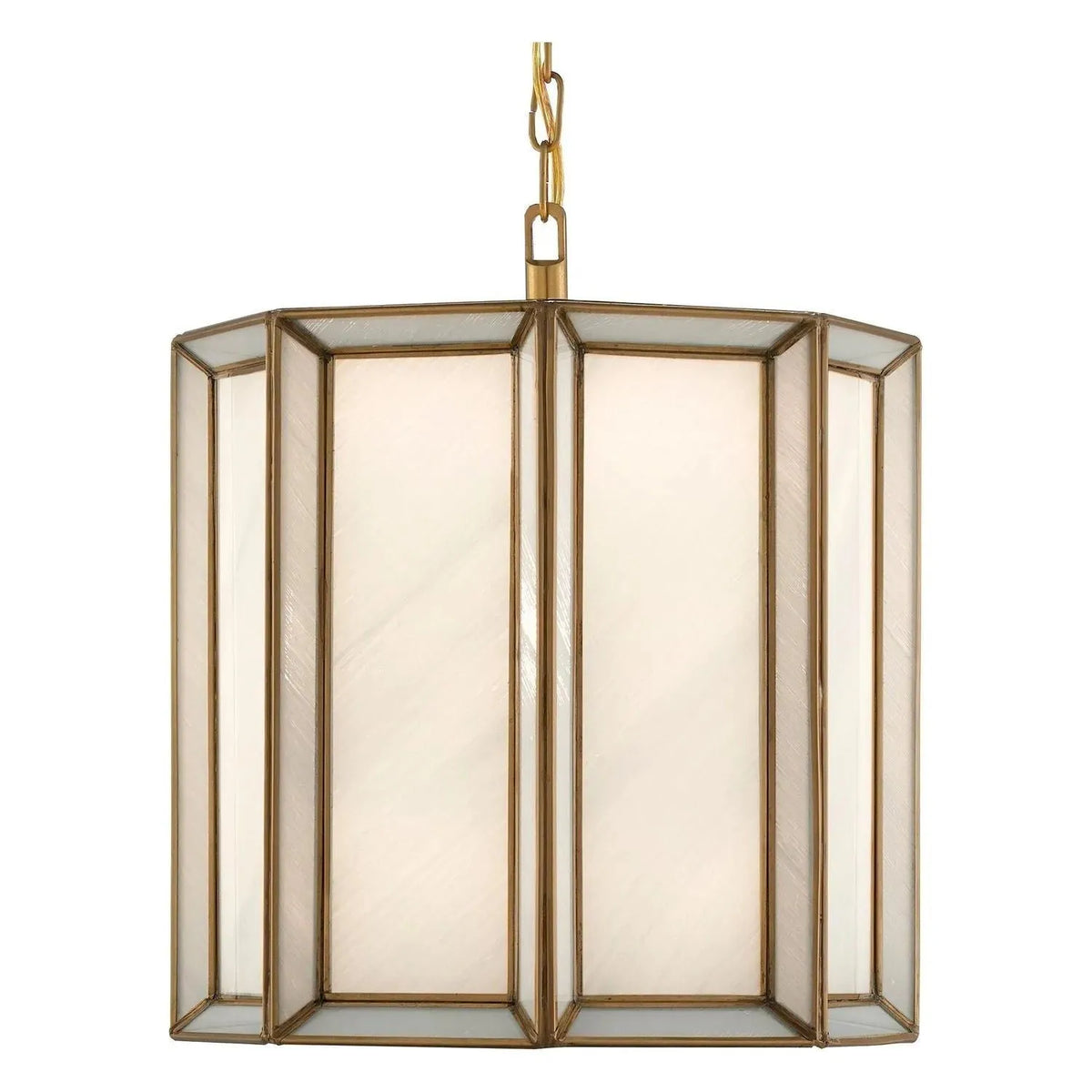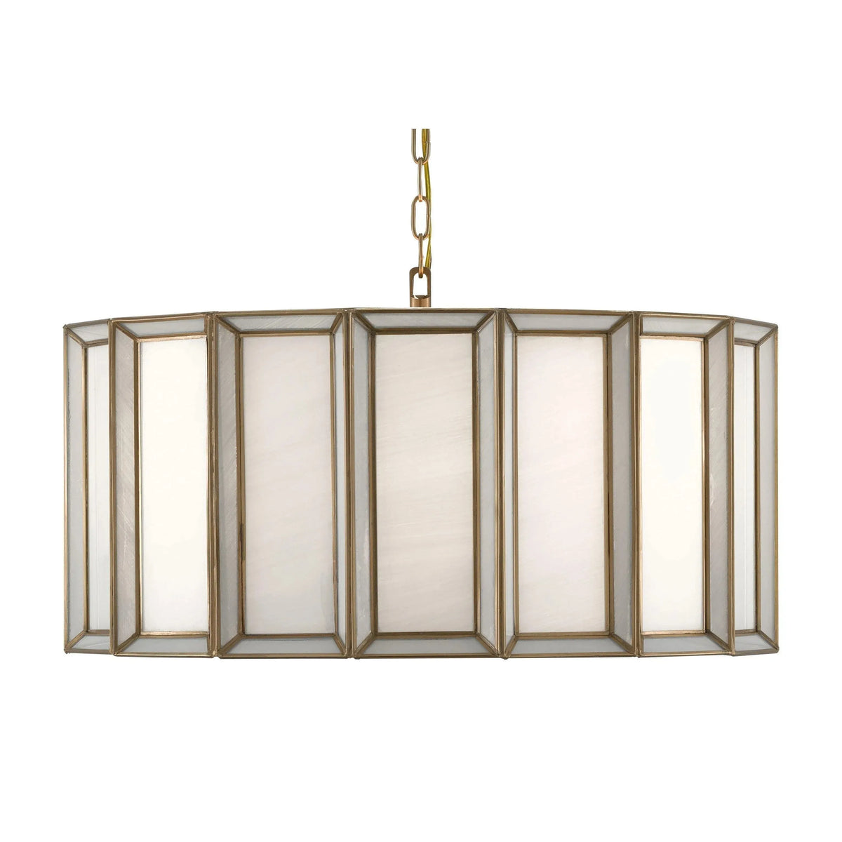 When a soft glow is desired, milk glass is one of the best materials to diffuse illumination. Our Daze Pendant is made of articulated panels of white milk glass that are joined together by ribs of metal in an antique brass finish. This milk glass pendant will turn luminous when it is switched on.