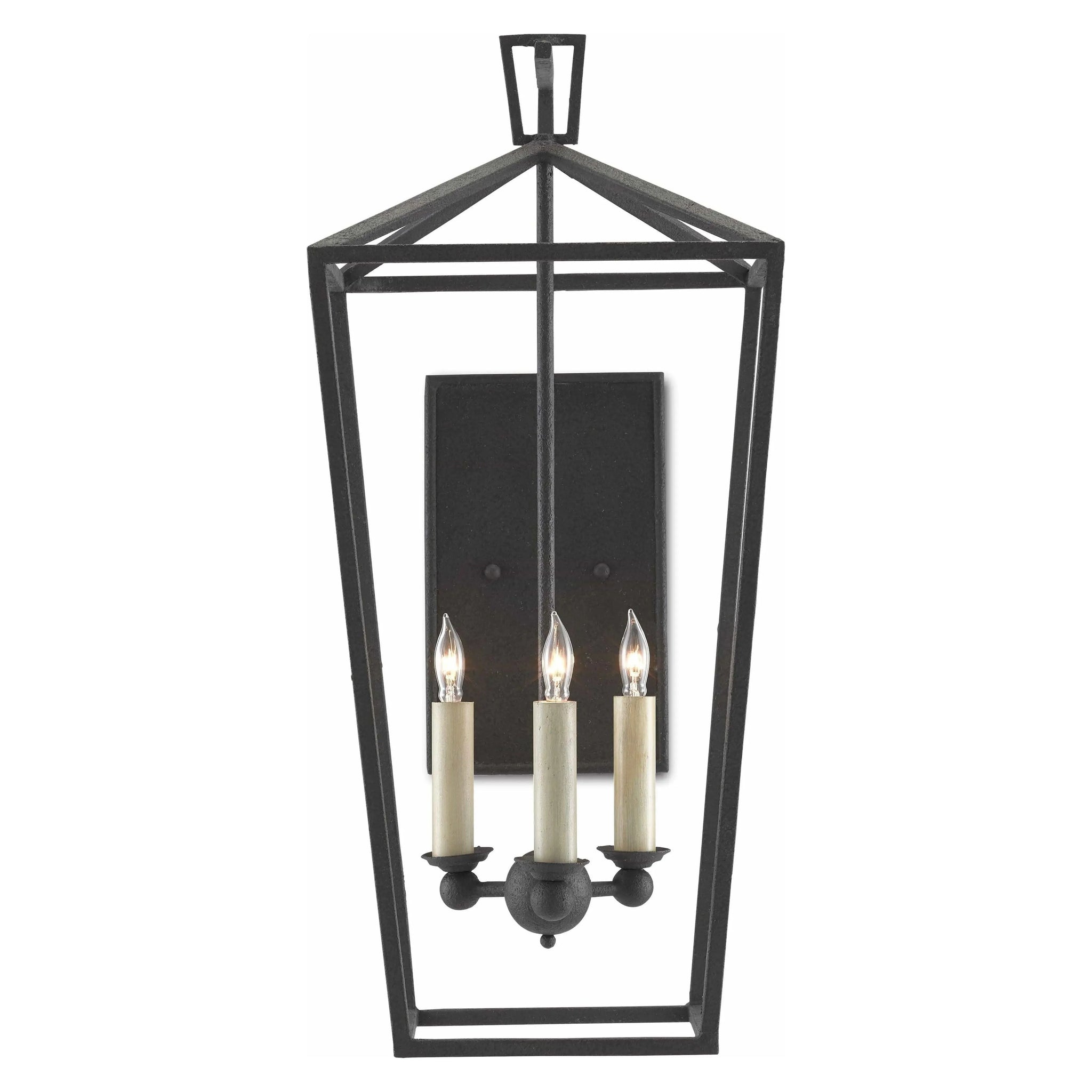 The Denison Wall Sconce is a hammered wrought-iron fixture in a Molé black finish. The classic lantern shape has stood the test of time to make it one of our most popular offerings. A design element of note is the square that fastens the lantern to the chain. This black sconce, certified for damp locations, is one of a number of sizes and finishes in the Denison family.