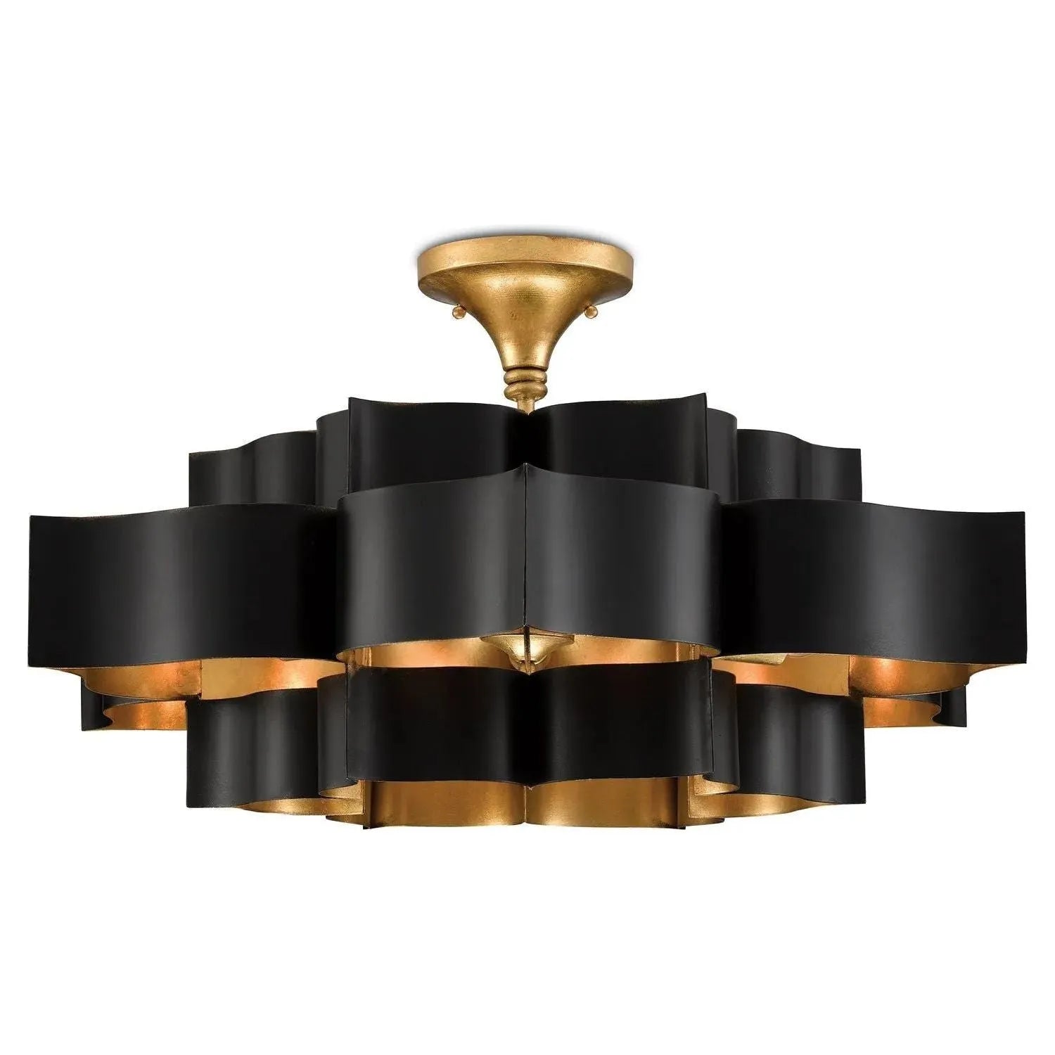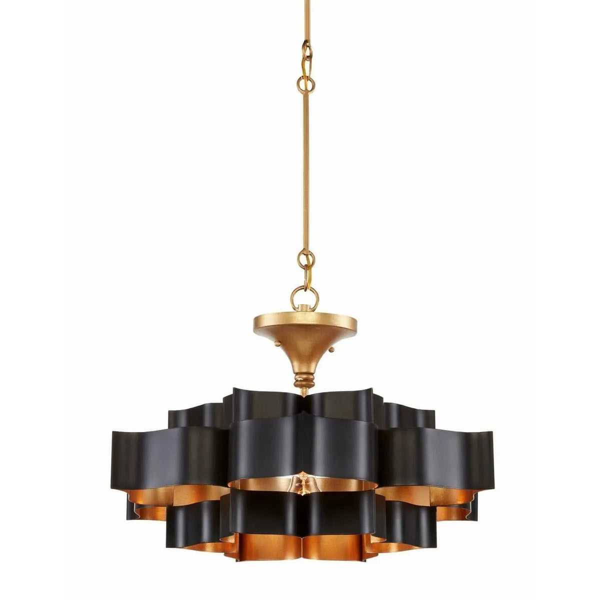 Introduction – The Grand Lotus Chandelier from Currey and Company is a sculptural, modern‑glam ceiling fixture designed for dining rooms, entryways, or living spaces where a dramatic focal point is desired. Its layered, lotus‑inspired silhouette blends satin black exteriors with a warm gold‑leaf interior to deliver a refined, ambient glow.