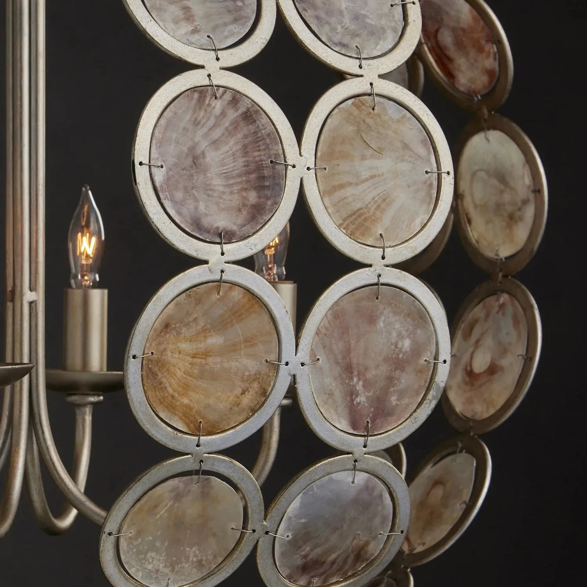 • Materials: Hand-arranged capiz or coco shell discs set within thin metal rings, suspended on a wrought-iron frame finished in contemporary silver leaf or coco cream.