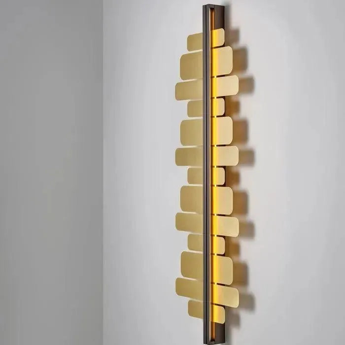 The Strate Score Wall Sconce features a grouping of rectangular brass slats linked by an illuminated linear frame. Strate's large size and modern geometric aesthetic give it a sculptural expression that will anchor any space's decor as an eye-catching centerpiece. Includes 4.7 inch W wall plate to cover standard US junction box (not pictured).