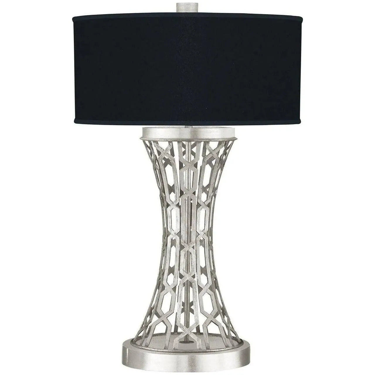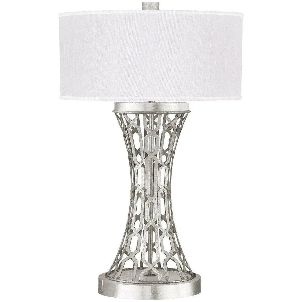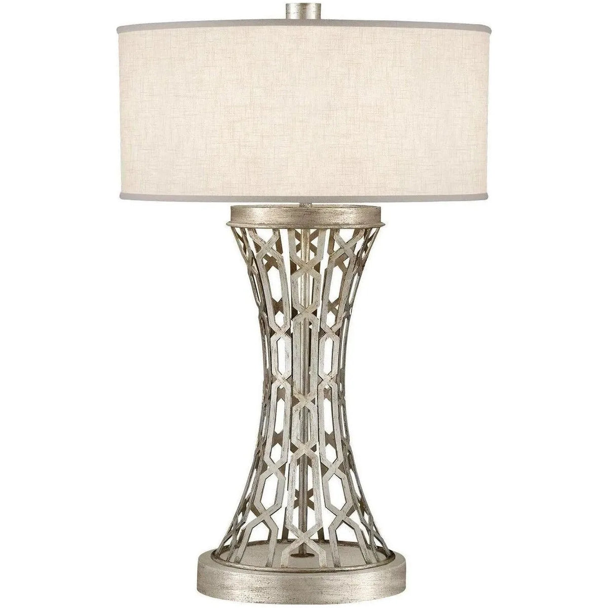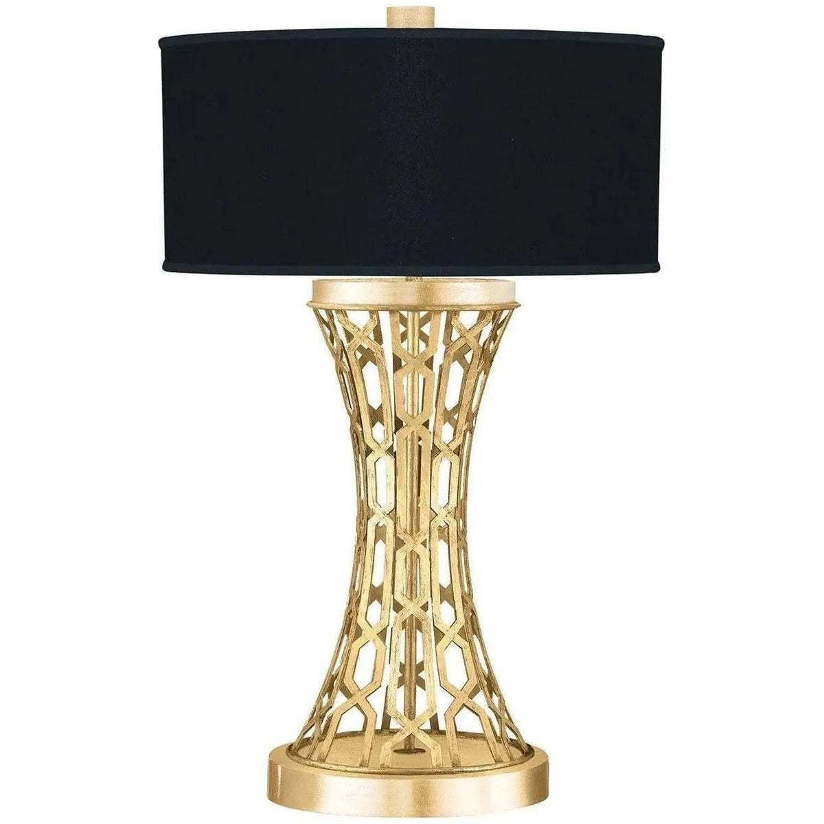 Table lamp in a burnished gold leaf finish with subtle brown highlights and white textured linen shade.