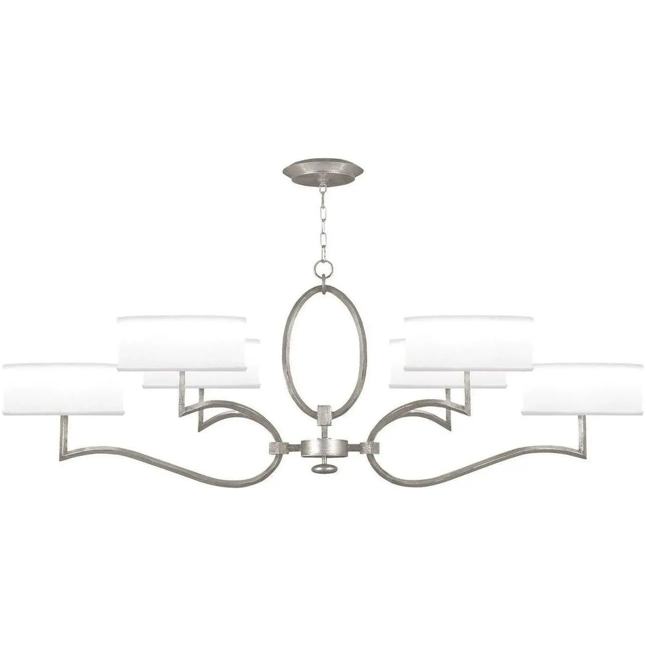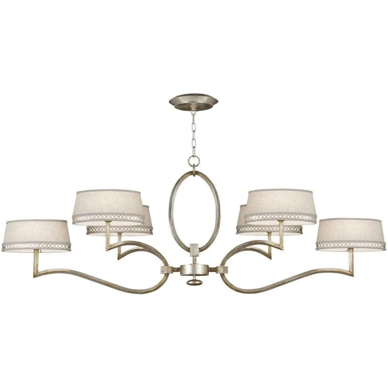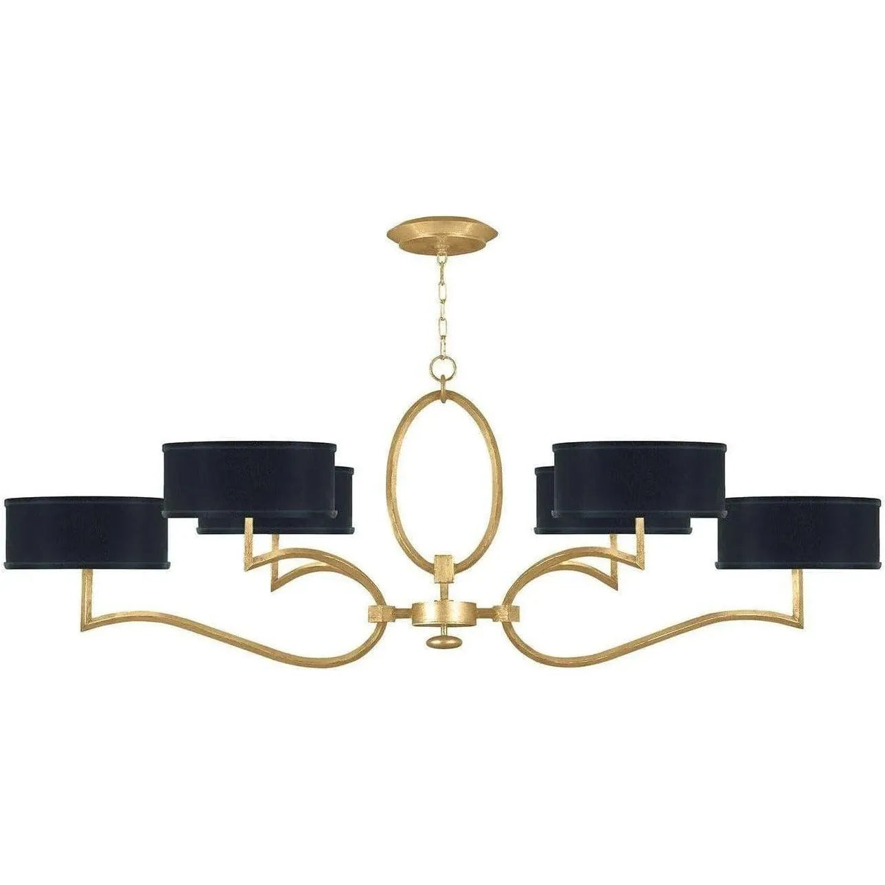 Oblong chandelier in a burnished gold leaf finish with subtle brown highlights and white textured linen shades with pierced metal gallery in matching gold leaf finish.