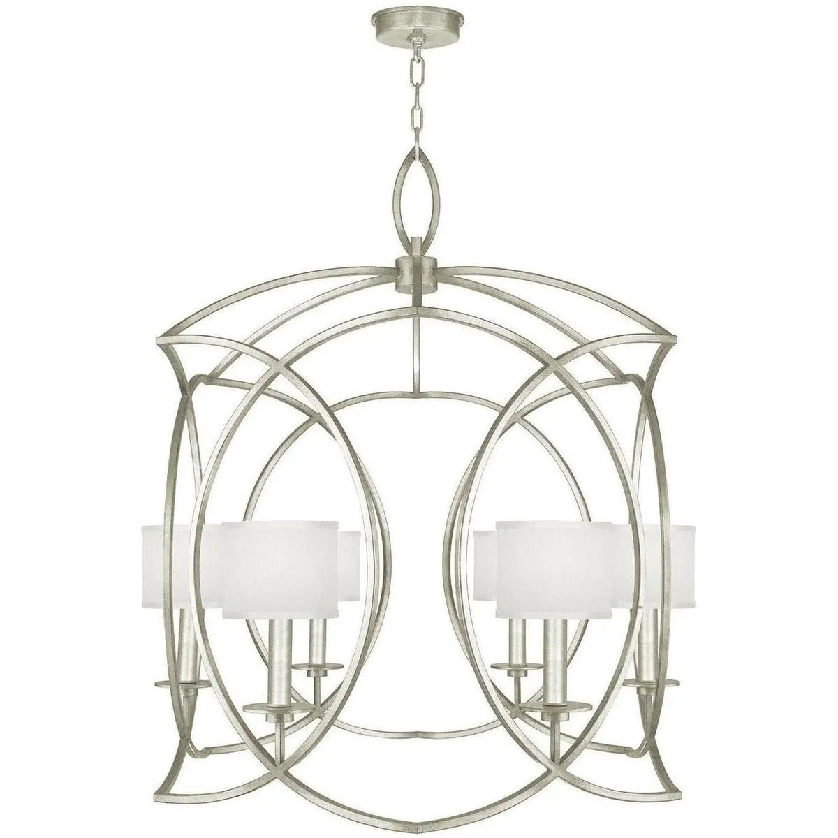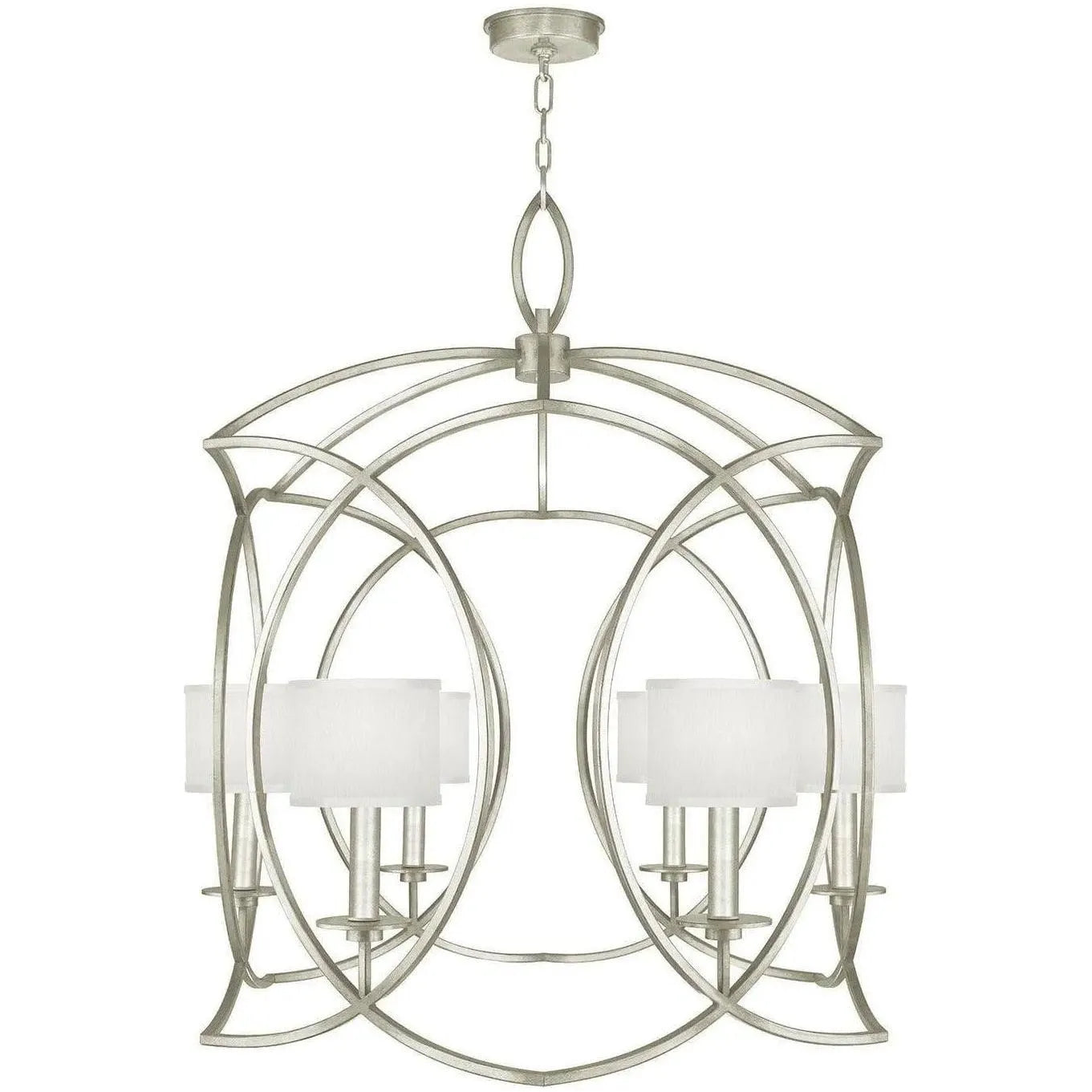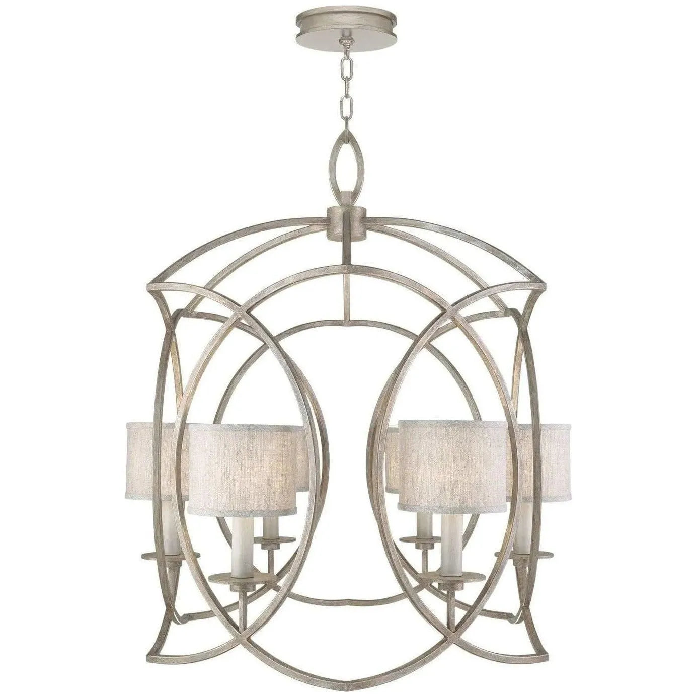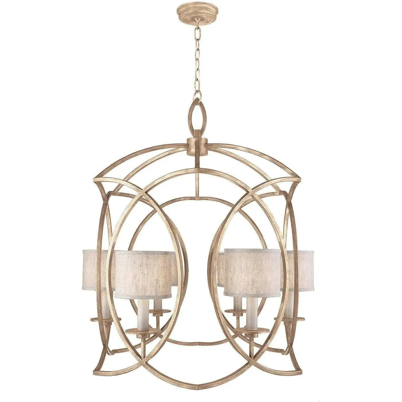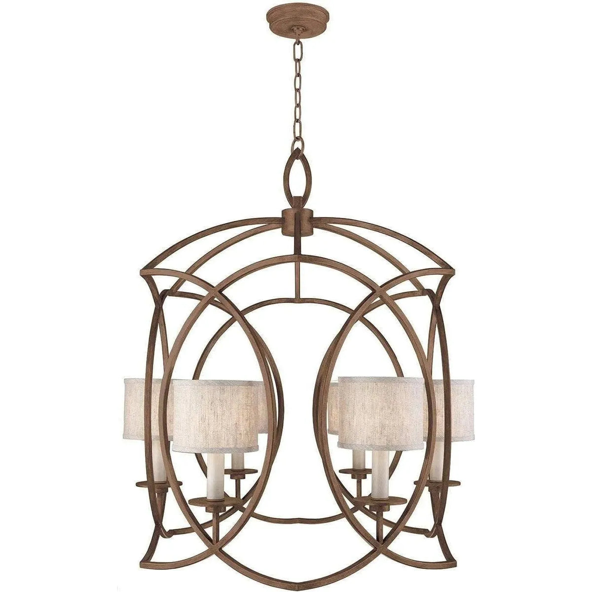 Executed by skilled metal artisans, this antique bronze chandelier is inspired by the 1920's unique transitional period in architecture & design in Cienfuegos. Also available in soft gold or weathered greige patina. Includes textured natural greige fabric shades.