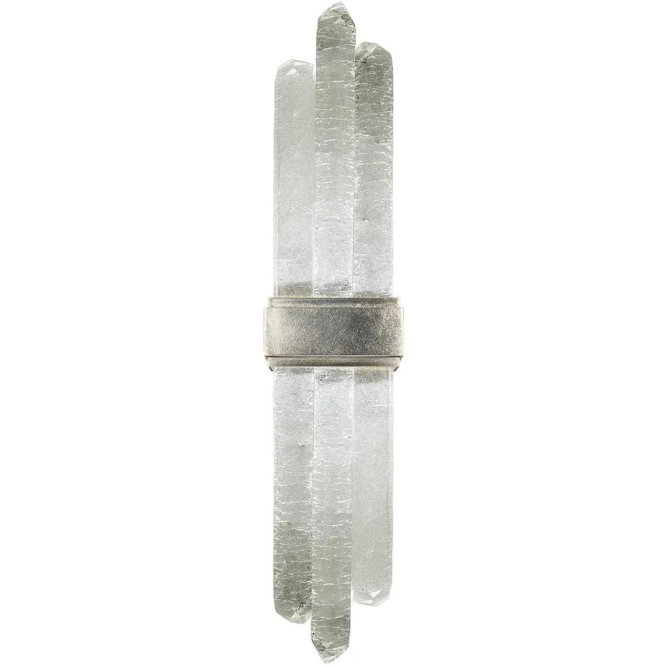 LED sconce influenced by the ephemeral appearance of illuminated rock crystal, which has been interpreted into handmade glassworks with the collaboration of the Fine Art Lamps studio glass master craftsmen. Formed of glass spires that mimic natural crystal formations as much as they do rays of sunlight, and clean metal lines in unadorned but precious finishes. Available in silver leaf, gold leaf and patinated bronze in either 2700K or 3000K temperatures.