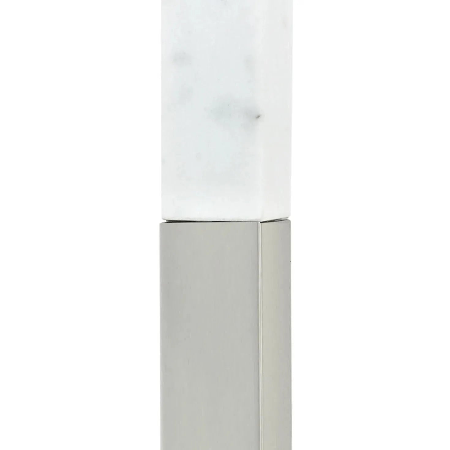 White marble and Polished Nickel marry in this tall table lamp, which puts a modern twist on a candlestick silhouette. A crystal base adds to the sophistication. Place this table lamp — and its coordinating floor lamp — in a bedroom for a striking statement. Also available in an Antique Brass finish.