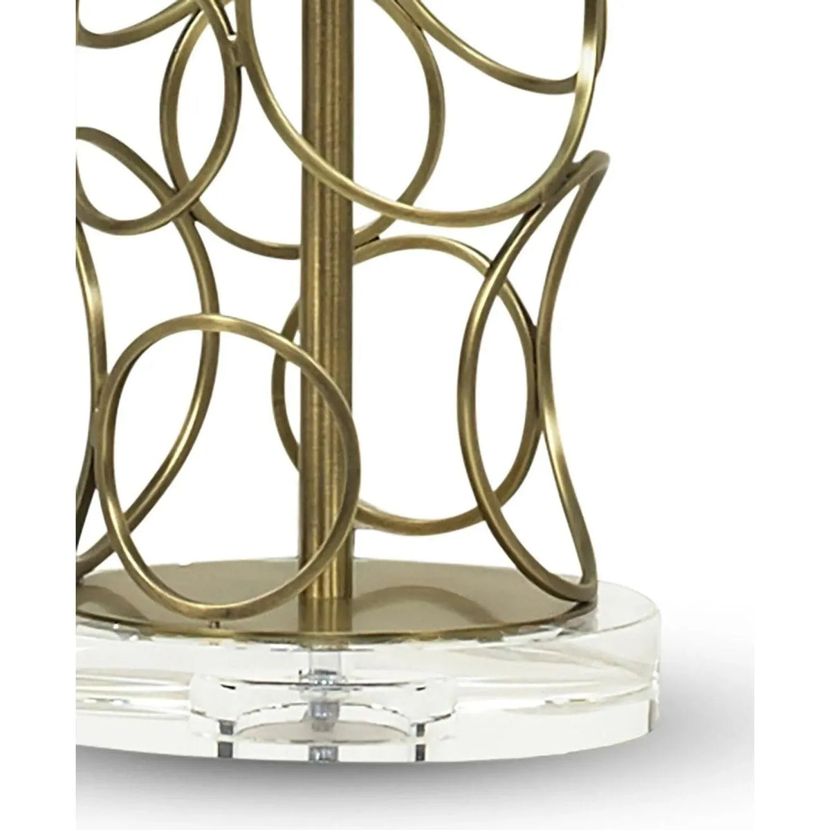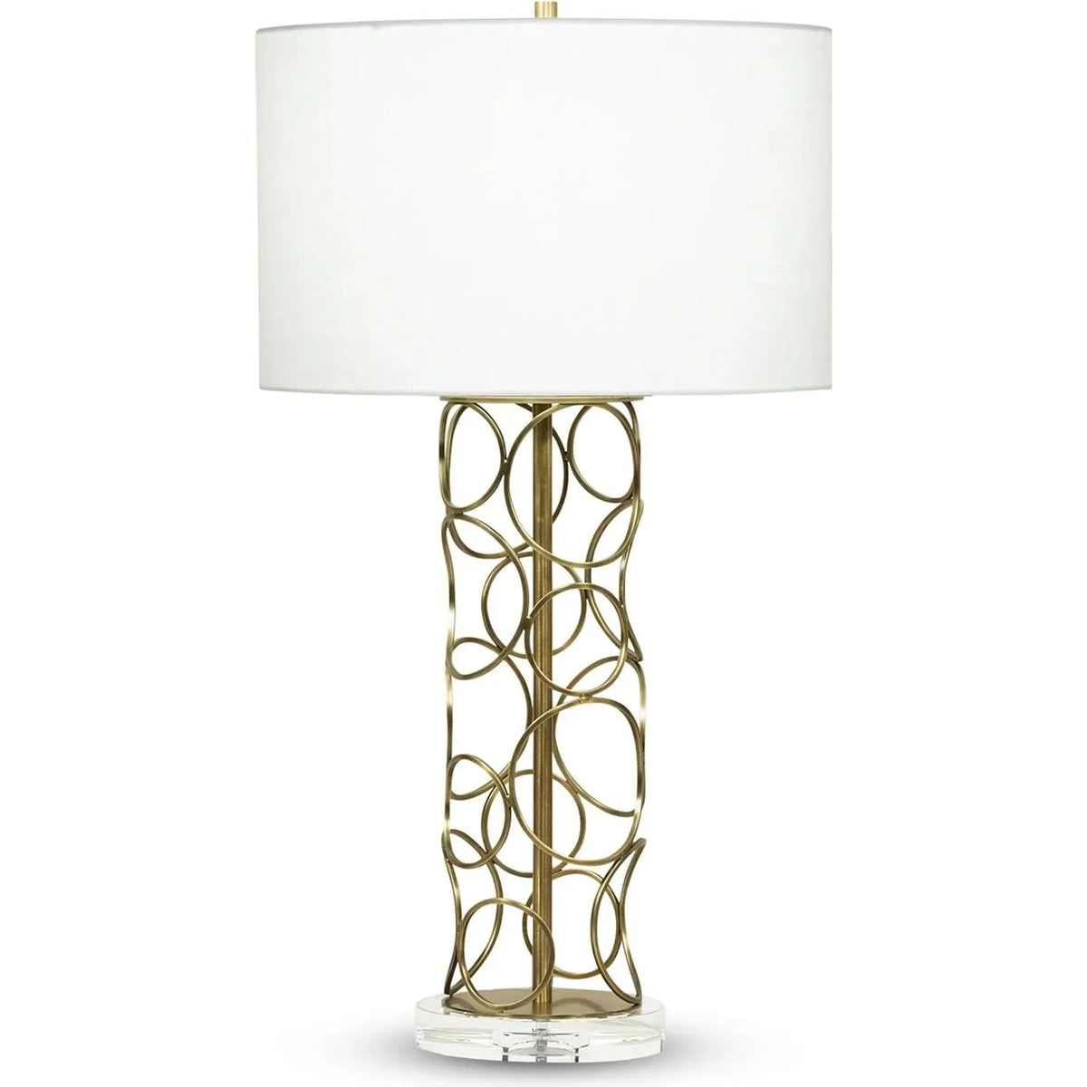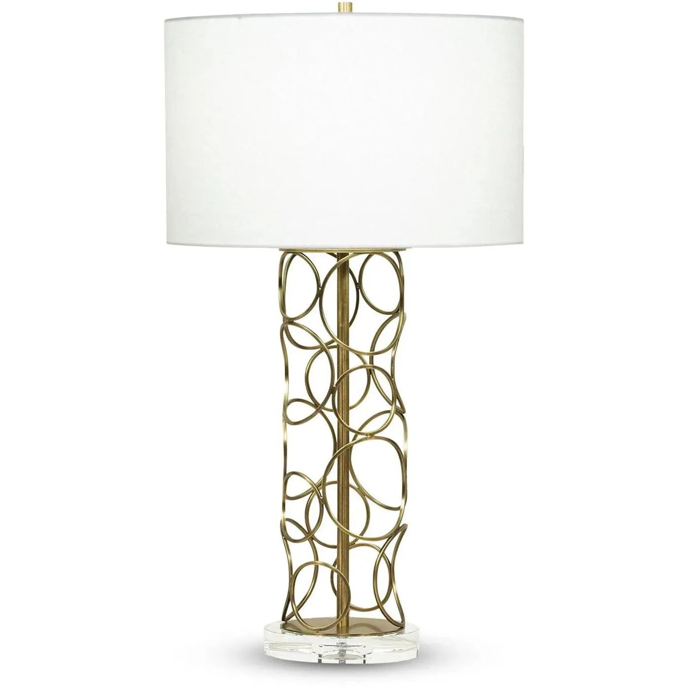 In this table lamp, an airy silhouette created from delicately bent metal circles is dressed in an Antique Brass finish. Paired with its beautiful crystal base and Off-White linen drum shade, this lamp would look right at home in an eclectic entryway or feminine bedroom.