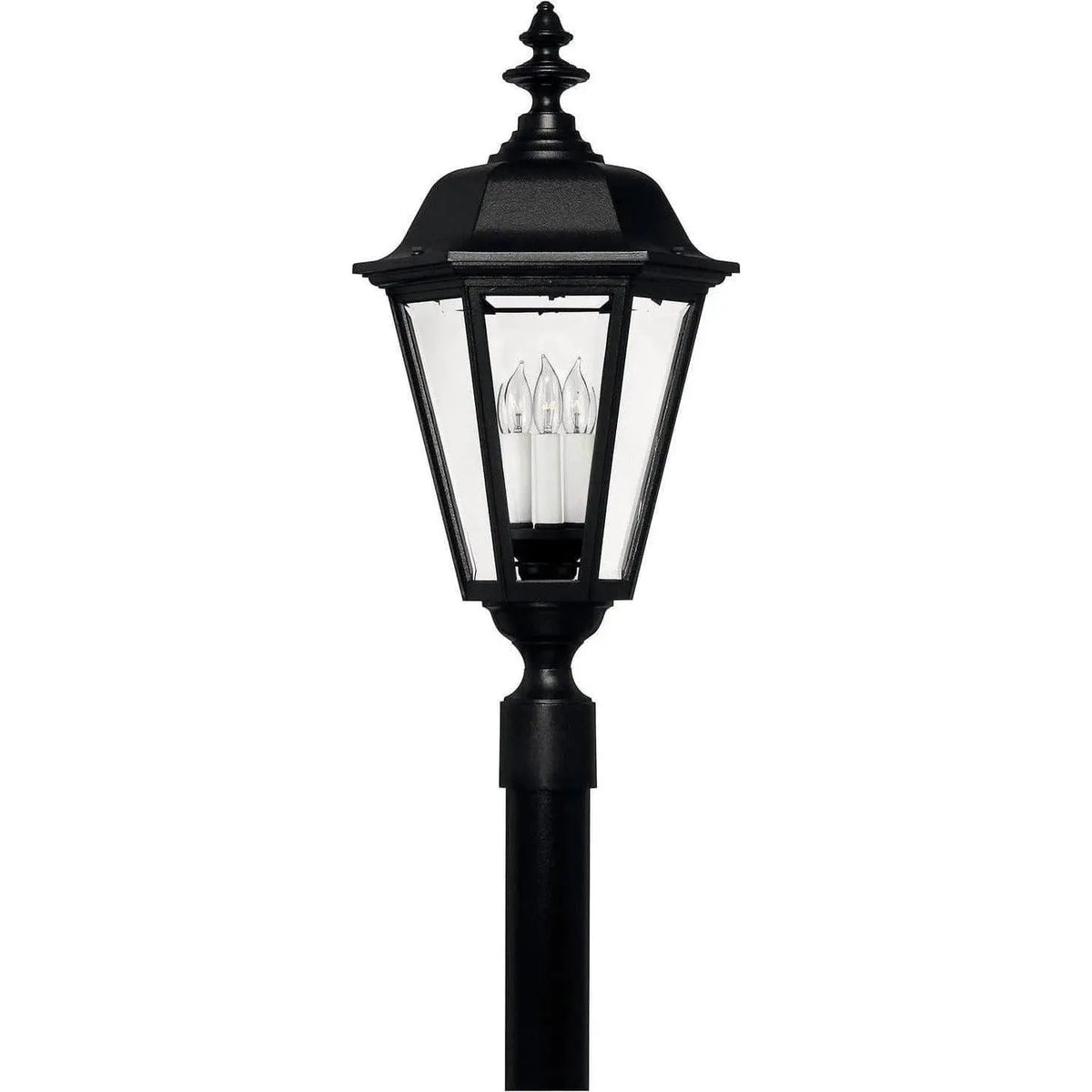 Manor House is a classic lantern design featuring durable cast aluminum, clear beveled glass panels and a bold Black finish. Select-A-Lite options come standard with both candelabra and medium based sockets.