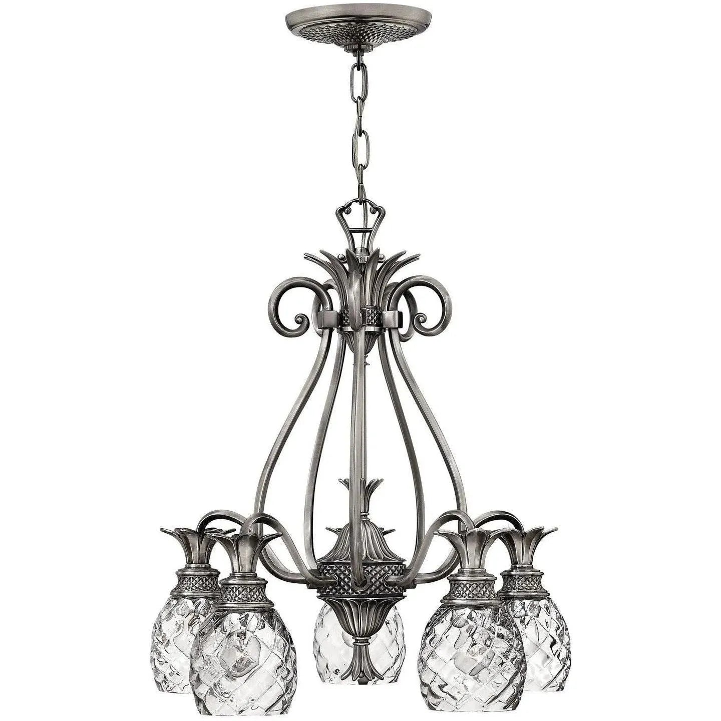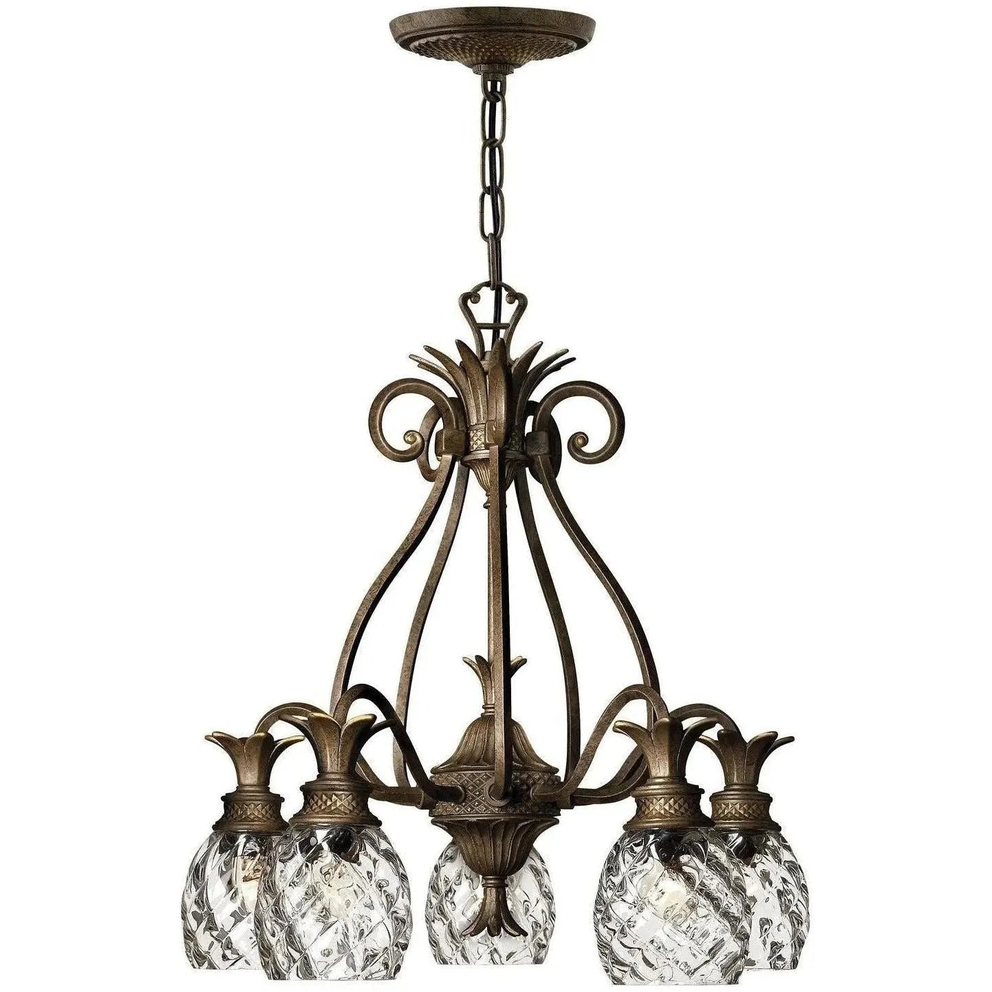 A Hinkley classic, the ornate Plantation collection features exceptional pineapple shaped, clear optic glass that makes a noble statement with matching candle sleeves and elaborate, decorative cast detailing.