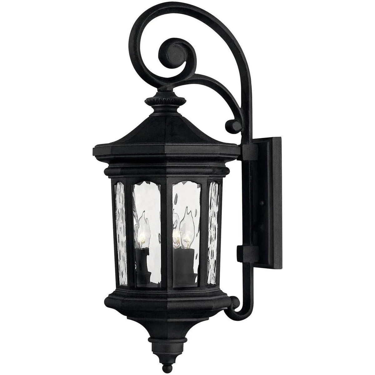Raley's regal appearance features cast aluminum construction, a bold Museum Black finish, flourishing details and clear water glass panels for a dignified style statement.