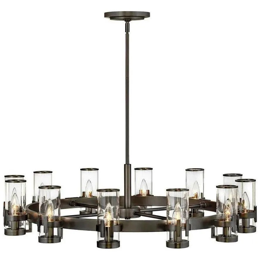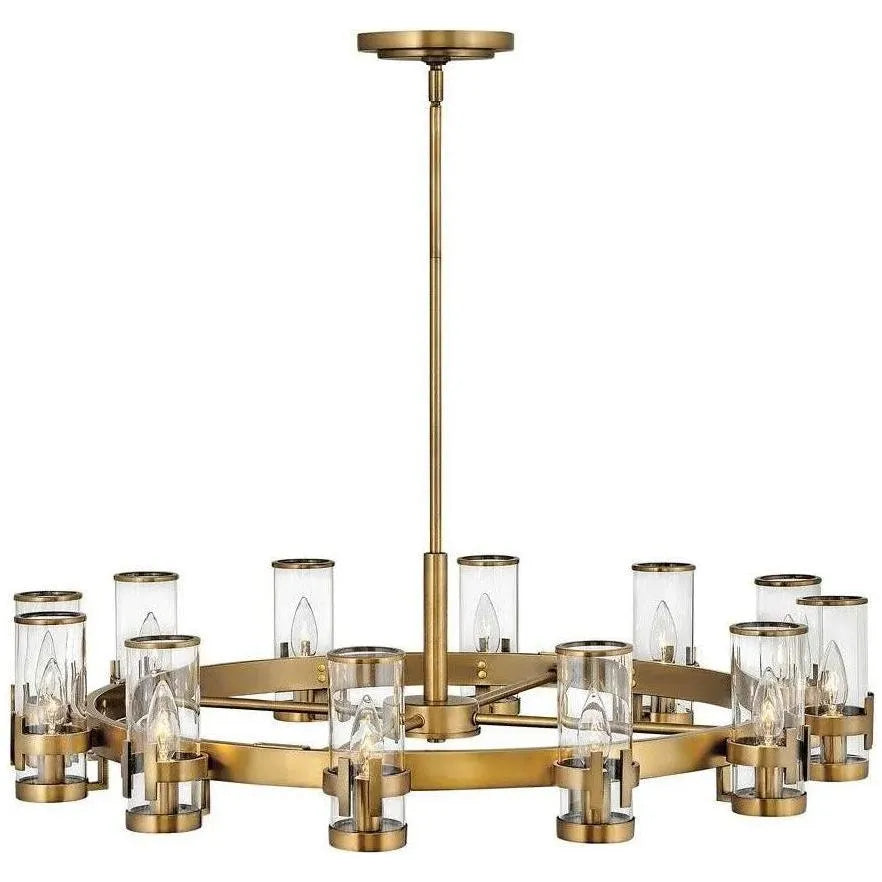 The Reeve chandelier balances sophistication with simplicity. The low-profile traditional silhouette is elevated by a wealth of elegant clear glass cylinders. Each glass is secured with a cast double-T bracelet matching the frame's luxurious finish, and finished with a corresponding metal band at the top.