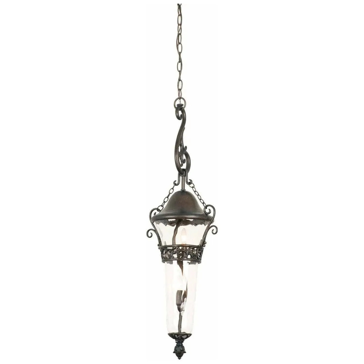 The Anastasia Outdoor collection combines eye-catching Art Nouveau scrollwork with traditional lantern design. The delicate curves of this design are highlighted by Kalco`s exclusive Outdoor finishes and our Clear Hammered Glass creates a flickering effect to the eletric lights. This combination is sure to add a touch of whimsical elegance to any outdoor space.