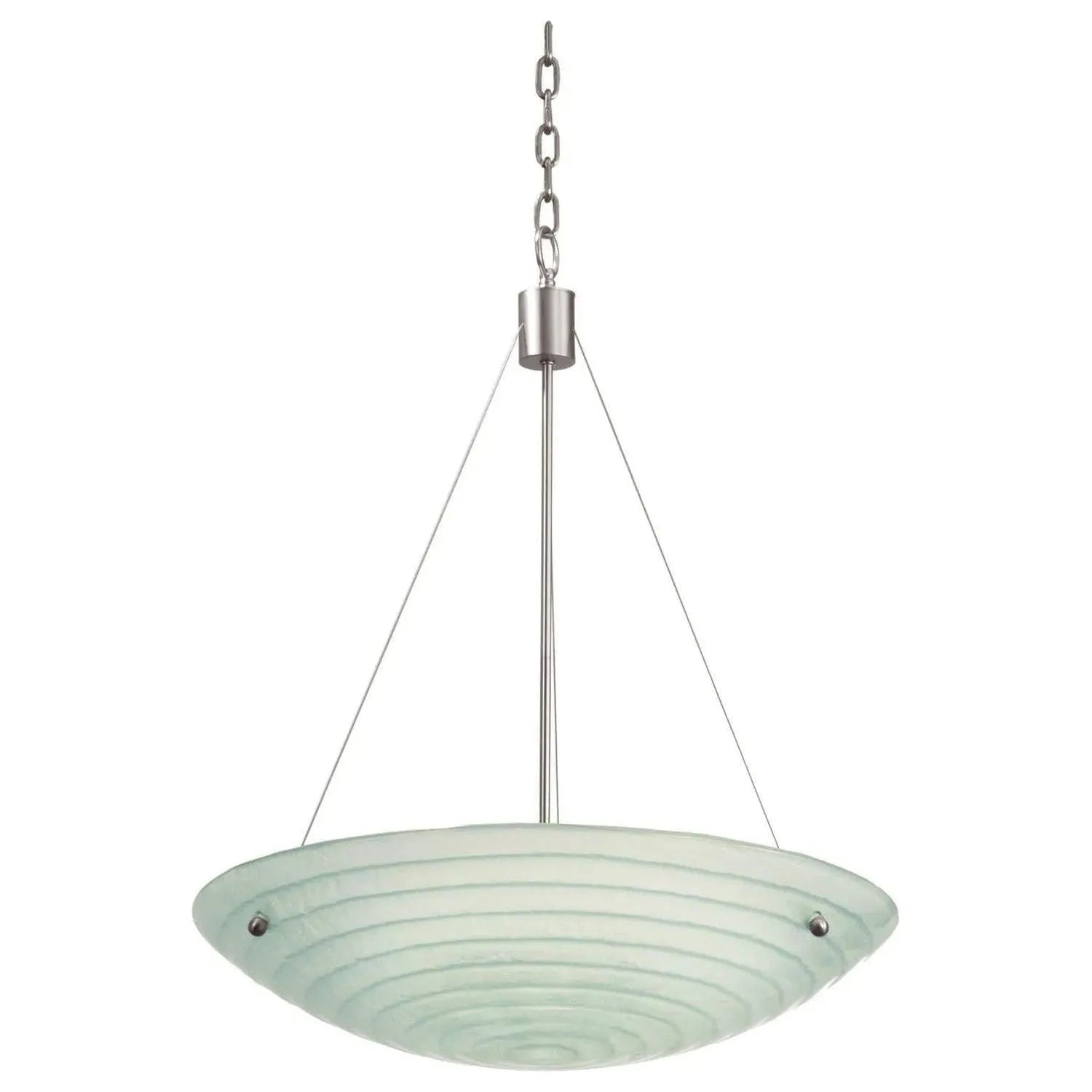 The design of our Aqueous Collection was inspired by the ripples of a stone thrown into the ocean. This collection features a slim stem with metal cables, finished in Kalco`s exclusive Satin Nickel, suspending a bowl of beautiful white frosted Costa Glass. The concentric circles etched into the bowl soften this sleek, modern pendant light.