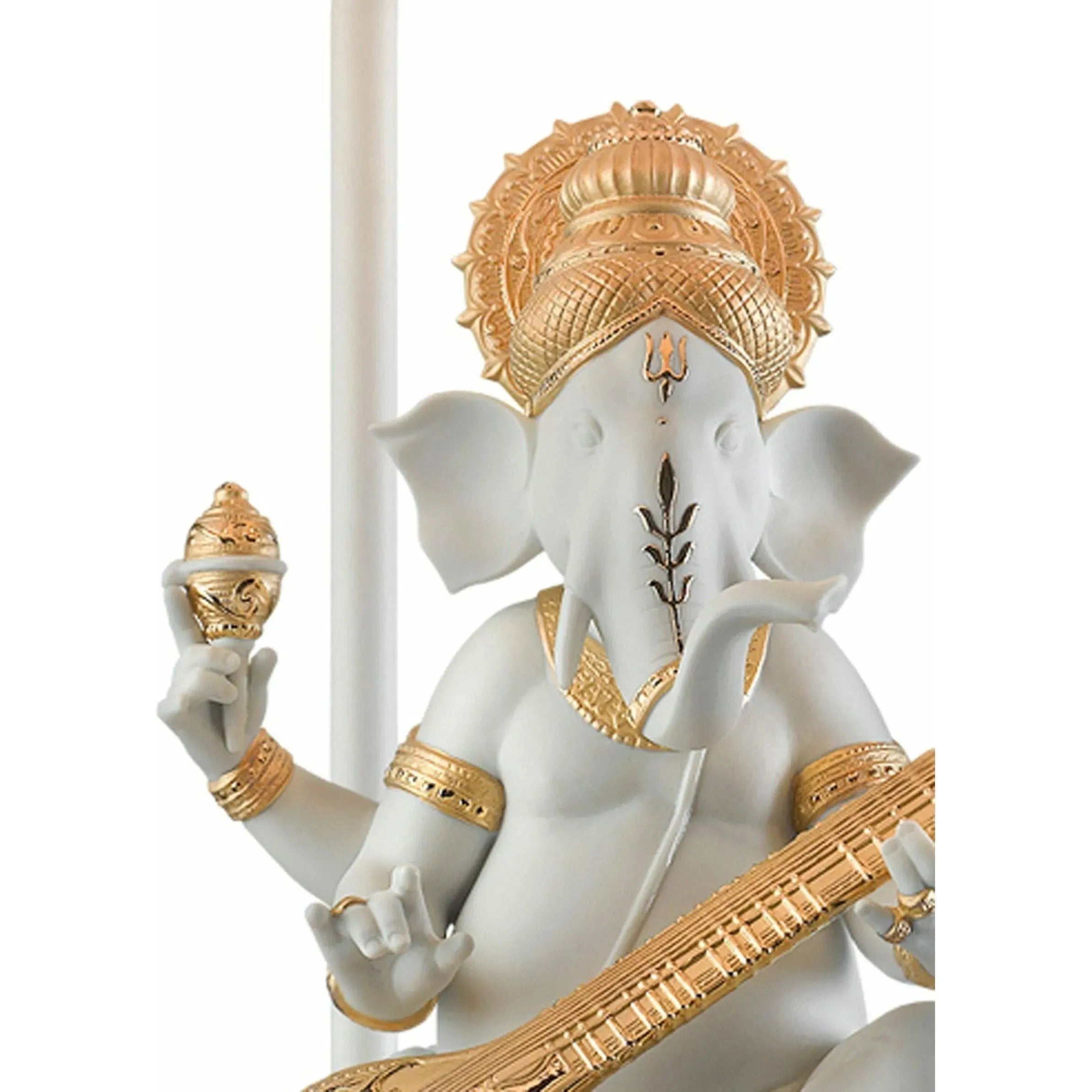 Table lamp with handmade design of the Ganesha figurine with veena and gilded luster.