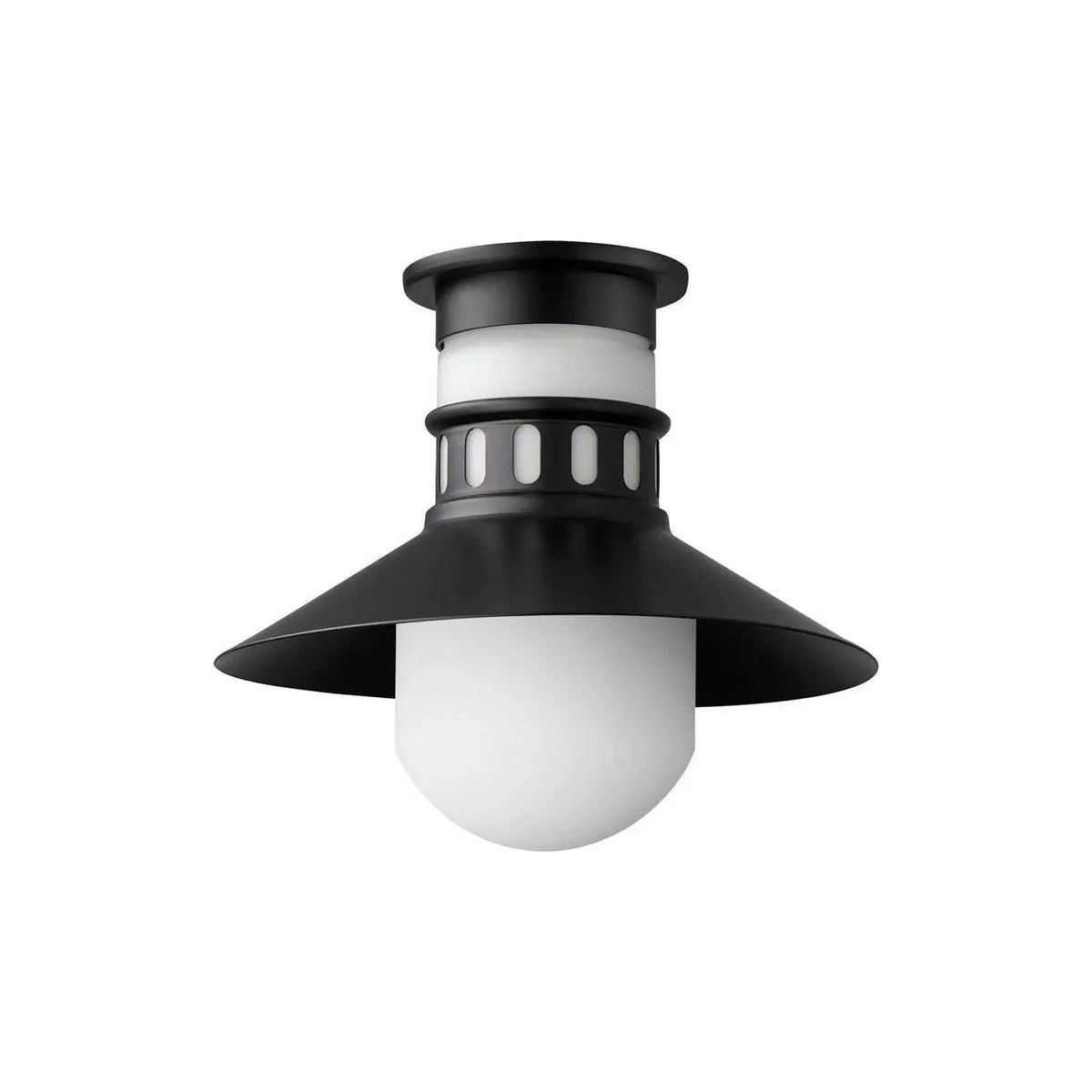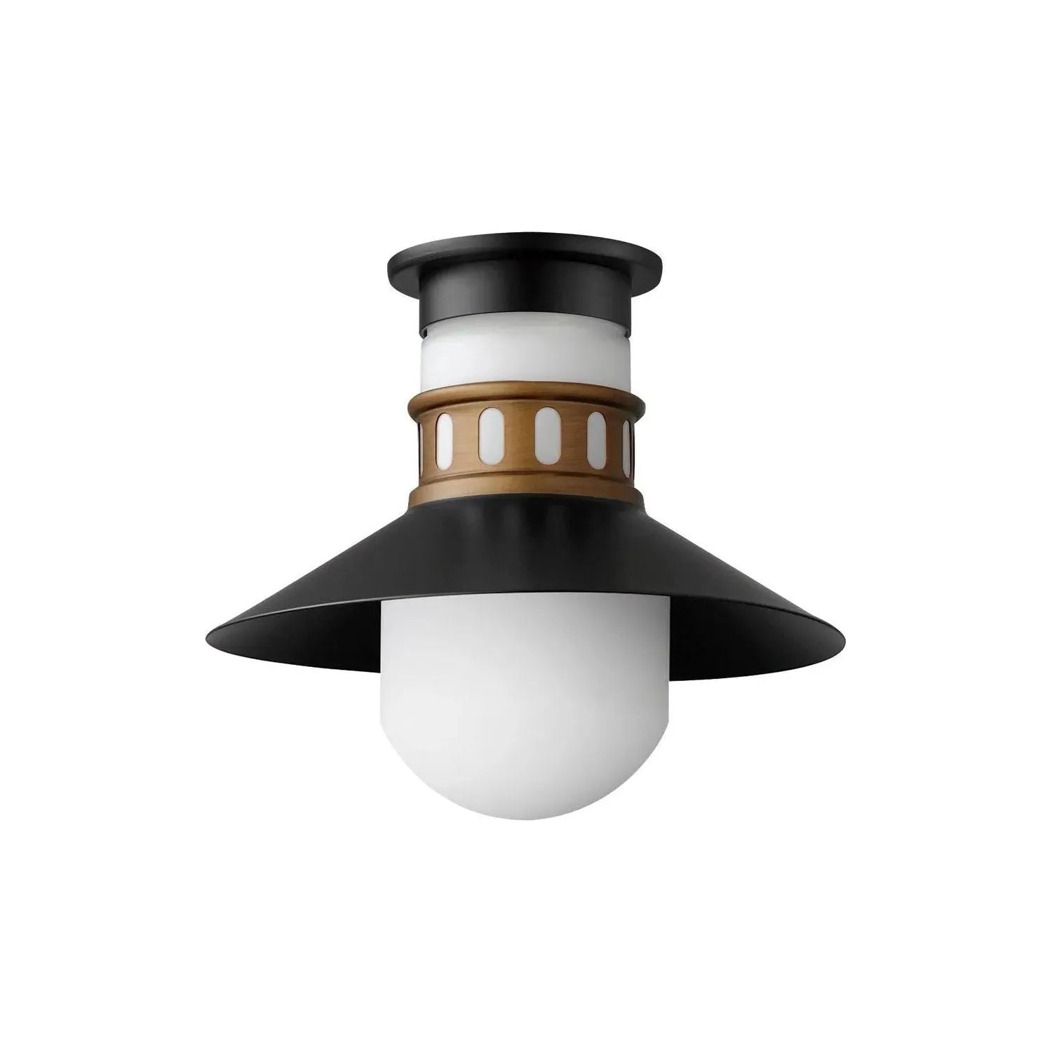 Coastally inspired, the wide brimmed aluminum spun shade on this series of outdoor rated sconces, pendants, and flush mounts features a tiered shade design. The ringed separation features a filigree of oval cut outs, whereby a single lamp illuminates the Satin White glass supporting it. The resulting light is dispersed both above and below the spun shade as well as through the patterned filigree. Both modern and classic homes can appreciate this classic design reimagined. The series is available either in Matte Black or a striking Two-Tone Black with Antique Brass.