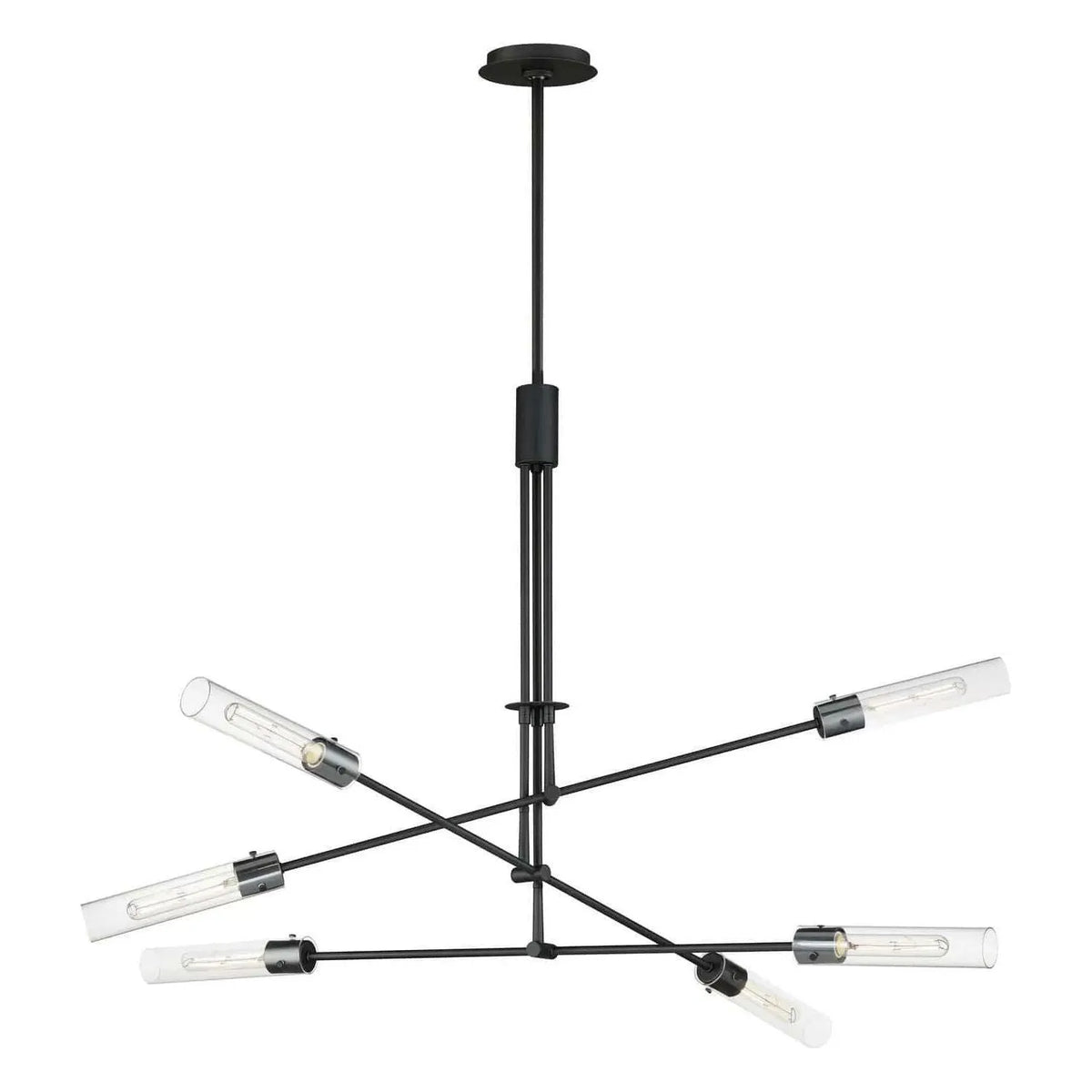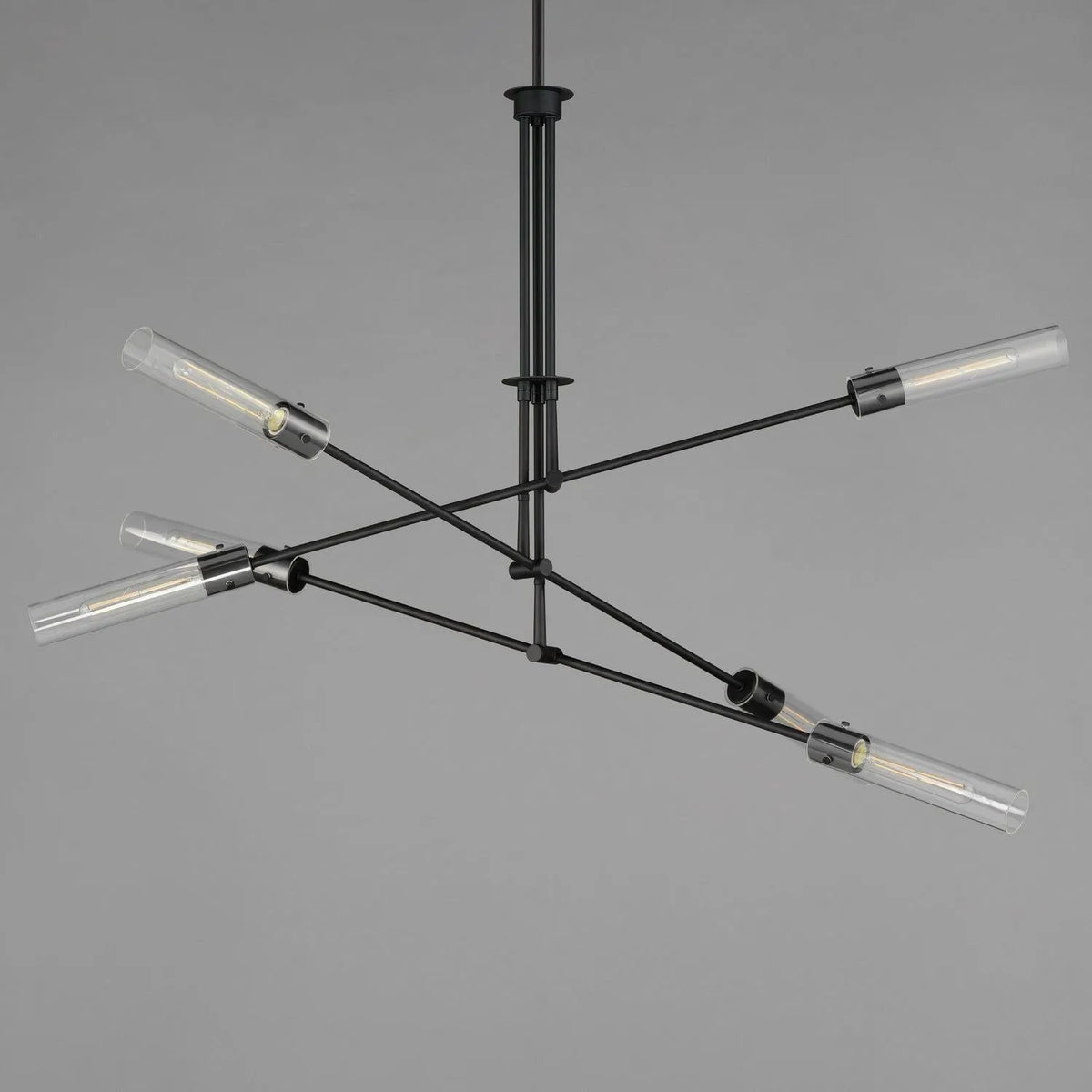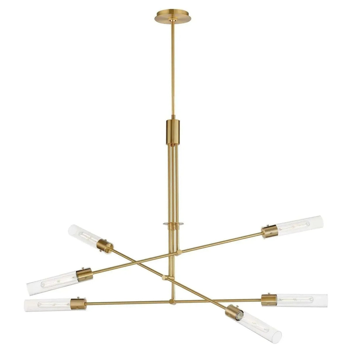 Dramatically modern, individually supported rods run through a series of flat circular disks adding interest to the elongated adjustable arms that can be configured according to how you choose to position them. Finished in Naturally Aged Brass and Matte Black finishes, the frames terminate at their ends with LED tubular lamps supplied and shrouded in long cylindrical glass shades secured with pins at the fixture`s sockets. The characteristic details and warm filament light source add industrial flair making the collection`s modern configuration suitable to a wider array of transitional styling.