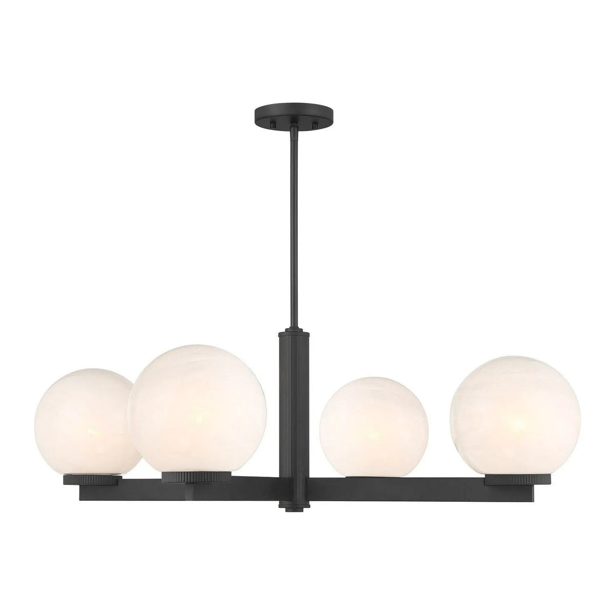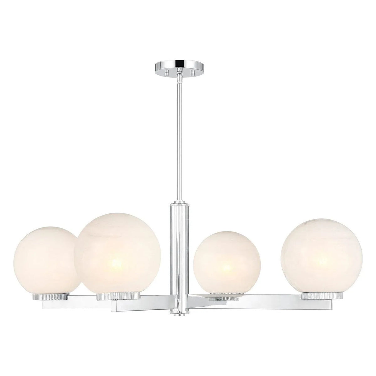 Chandelier M100123 by Meridian Lite Trends presents a refined Art Deco silhouette—slim, straight arms rising to four opaline strié glass orbs that diffuse light with a soft, swirling texture. The polished chrome structure and precision knurled collars deliver a crisp, tactile finish that reads modern yet timeless.