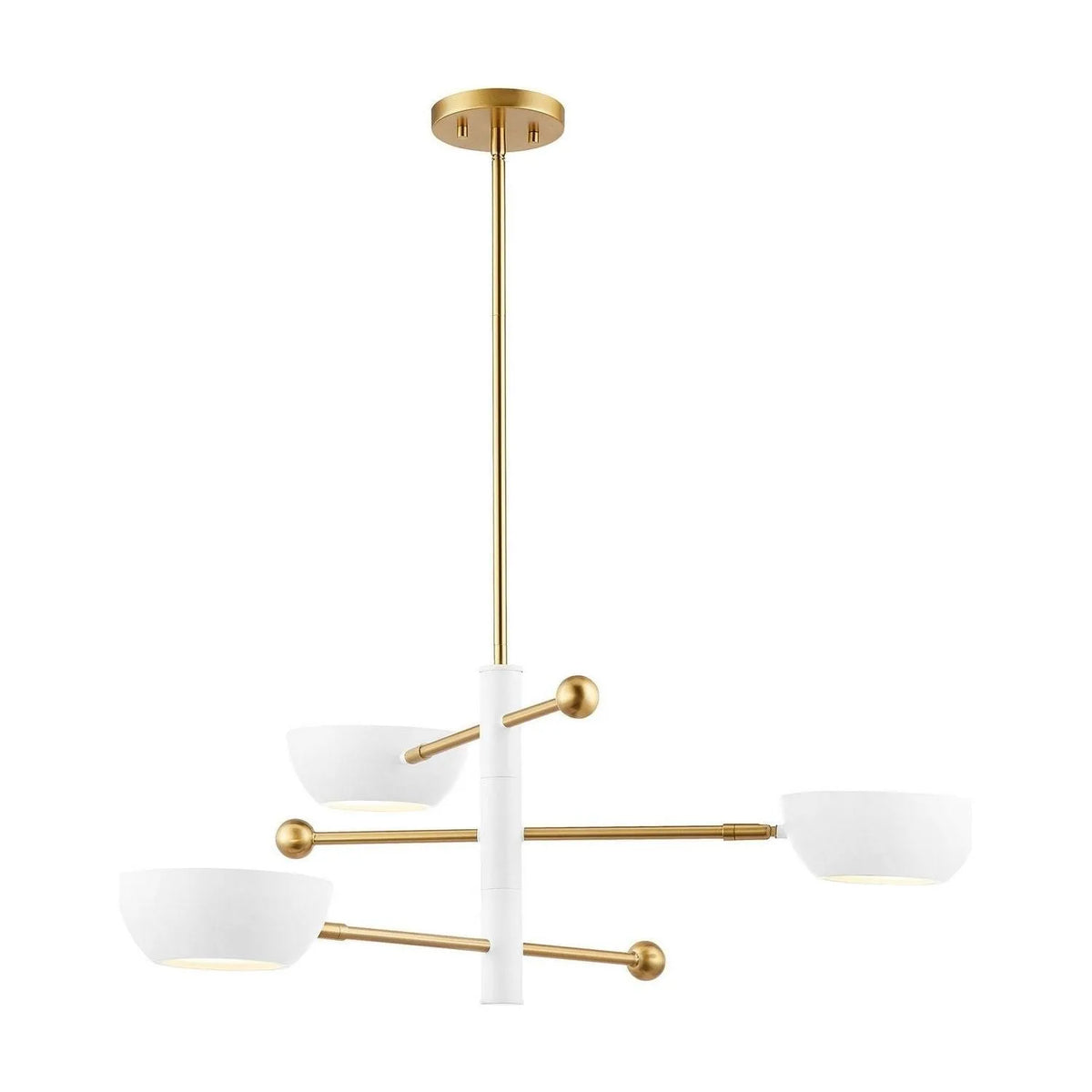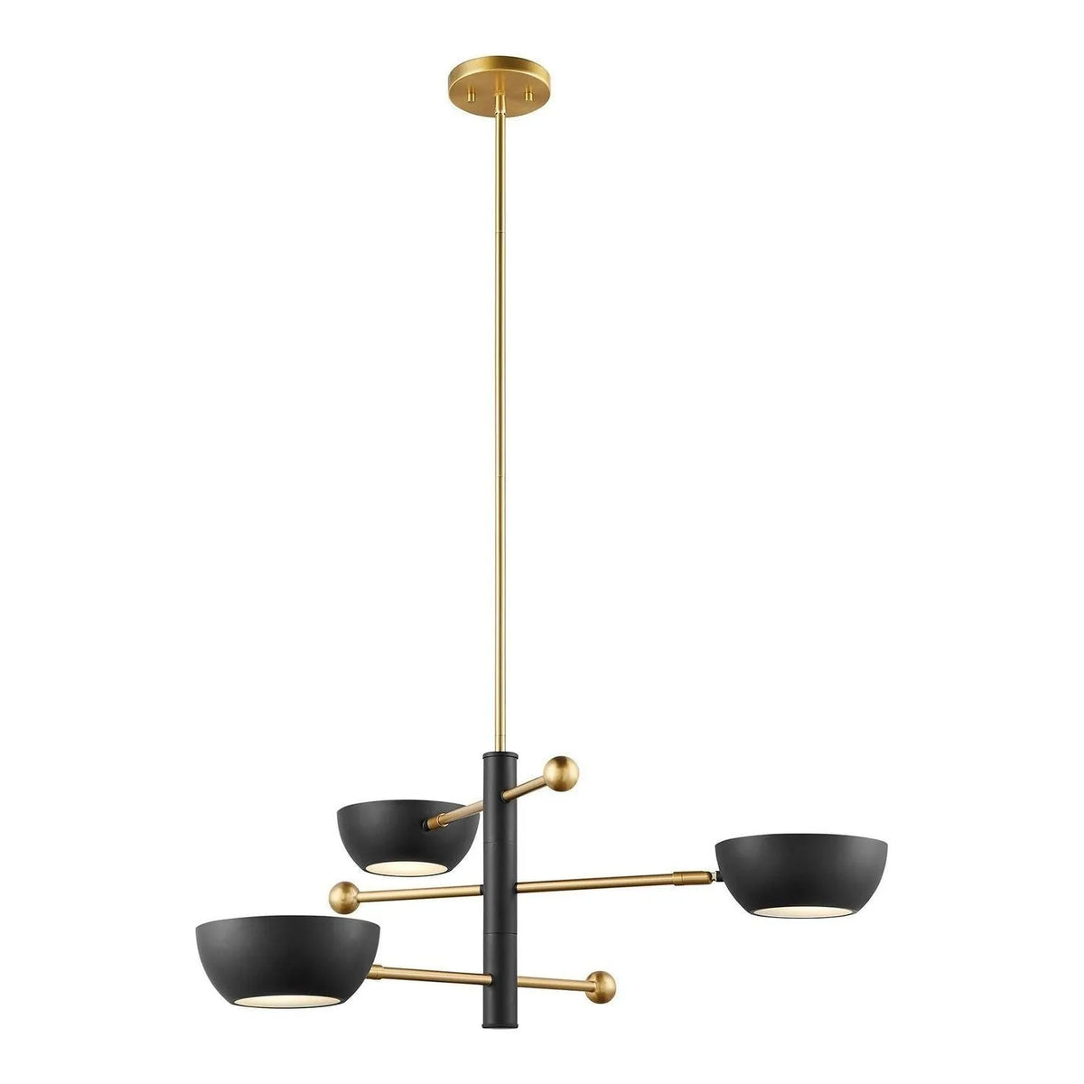Refined, sculptural lighting that balances form and function. The Meridian Lite Trends Chandelier M100143 presents a modern, three‑light pendant with matte black cupped shades mounted on adjustable satin brass arms — a studied composition that directs light both up and down for layered illumination.