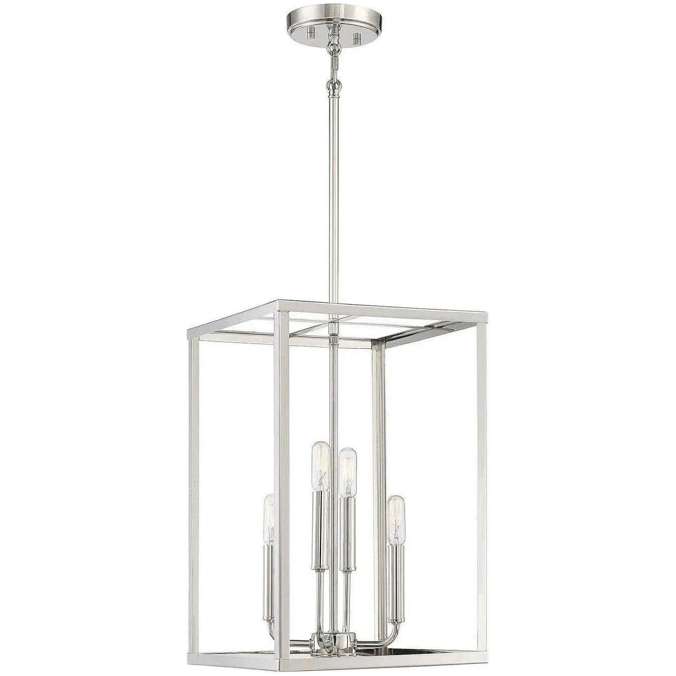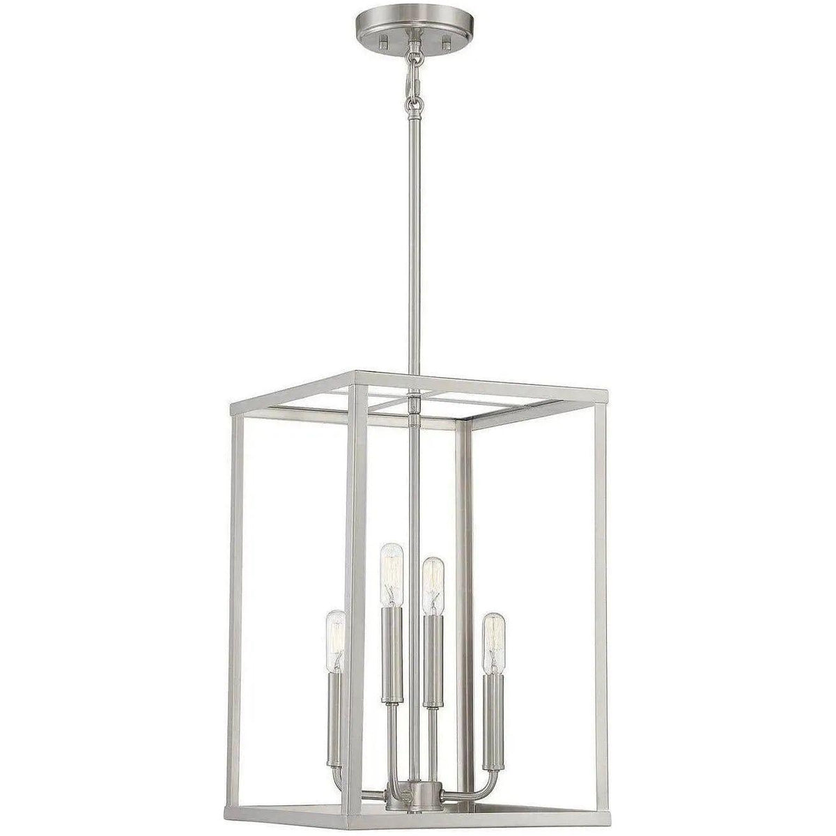 Meridian Four Light Pendant — a refined, geometric pendant designed to punctuate curated interiors with measured presence. The open, tall cubic frame in shining brushed nickel creates clean lines that expose four candelabra-style lights for even, architectural illumination.