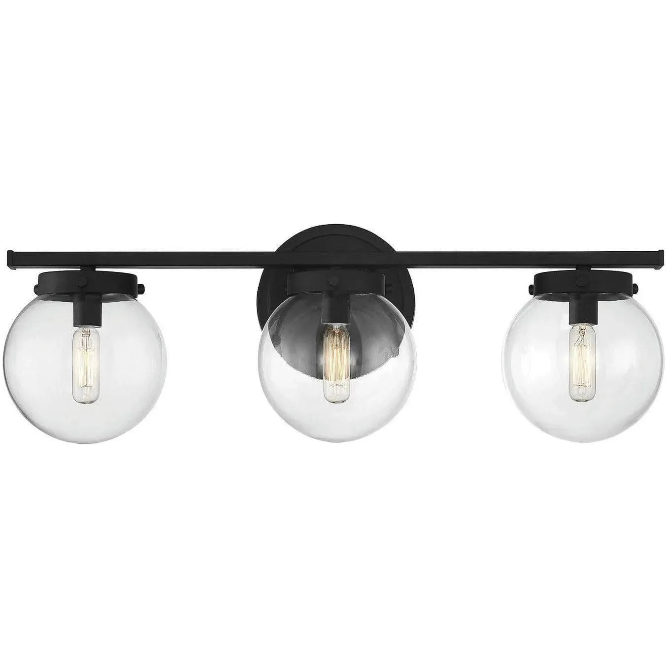 Designed to elevate contemporary baths, the Meridian Three Light Bath Bar pairs crisp geometry with soft, luminous globes. A slim matte-black metal arm and circular backplate provide a clean, architectural spine while three clear glass spheres sit beneath, showcasing tubular bulbs and offering even, shadow-free illumination.